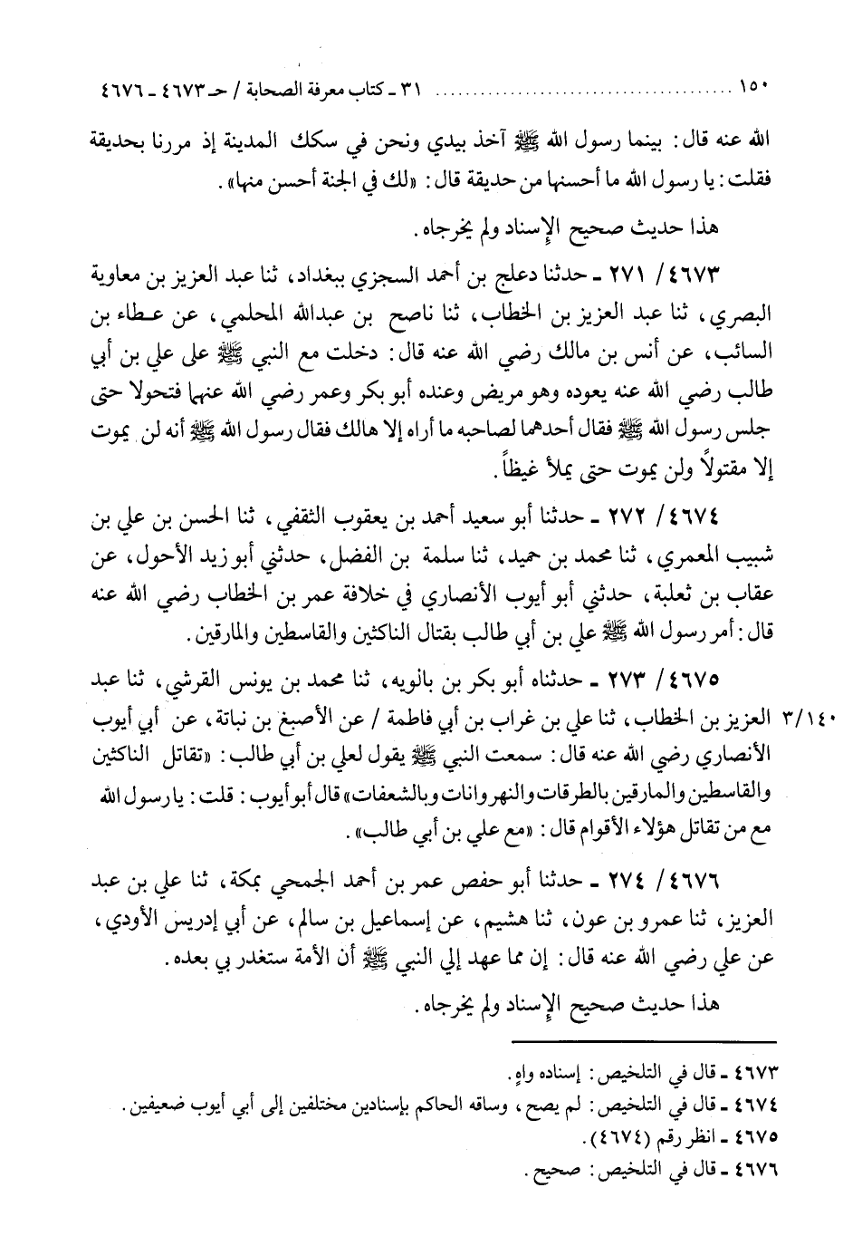 4675 - حَدَّثَنَاهُ أَبُو بَكْرِ بْنُ بَالَوَيْهِ، ثنا مُحَمَّدُ بْنُ يُونُسَ الْقُرَشِيُّ، ثنا عَبْدُ الْعَزِيزِ بْنُ الْخَطَّابِ، ثنا عَلِيُّ بْنُ غُرَابِ بْنِ أَبِي فَاطِمَةَ، عَنِ الْأَصْبَغِ بْنِ نُبَاتَةَ، عَنْ أَبِي أَيُّوبَ الْأَنْصَارِيِّ رَضِيَ اللَّهُ عَنْهُ، قَالَ: سَمِعْتُ النَّبِيَّ صَلَّى اللهُ عَلَيْهِ وَسَلَّمَ يَقُولُ لِعَلِيِّ بْنِ أَبِي طَالِبٍ: «§تُقَاتِلُ النَّاكِثِينَ وَالْقَاسِطِينَ، وَالْمَارِقِينَ بِالطُّرُقَاتِ، وَالنَّهْرَوَانَاتِ، وَبِالشَّعَفَاتِ» قَالَ أَبُو أَيُّوبَ: قُلْتُ يَا رَسُولَ اللَّهِ، مَعَ مَنْ تُقَاتِلُ هَؤُلَاءِ الْأَقْوَامِ؟ قَالَ: «مَعَ عَلِيِّ بْنِ أَبِي طَالِبٍ»