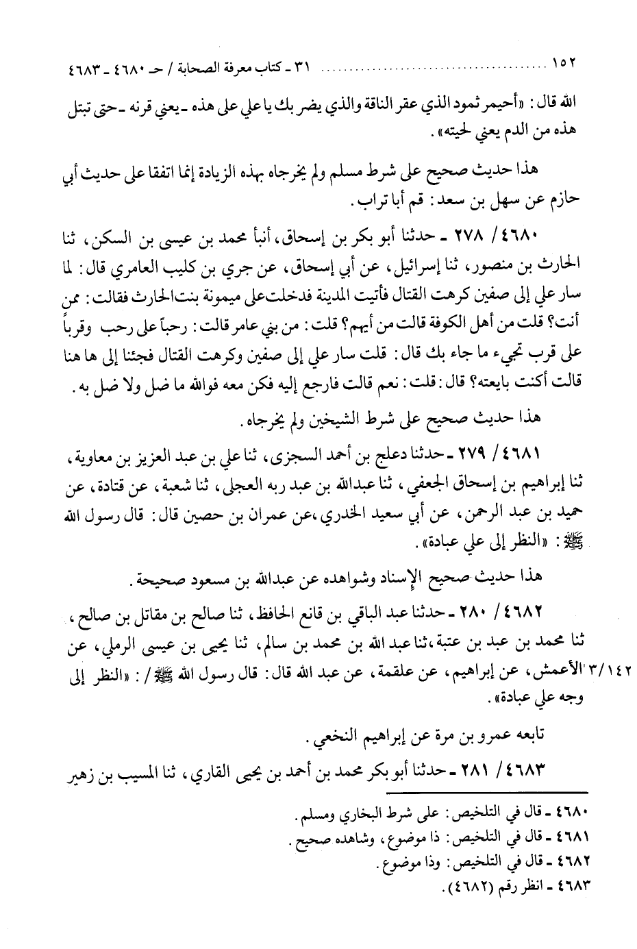 4681 - حَدَّثَنَا دَعْلَجُ بْنُ أَحْمَدَ السِّجْزِيُّ، ثنا عَلِيُّ بْنُ عَبْدِ الْعَزِيزِ بْنِ مُعَاوِيَةَ، ثنا إِبْرَاهِيمُ بْنُ إِسْحَاقَ الْجُعْفِيُّ، ثنا عَبْدُ اللَّهِ بْنُ عَبْدِ رَبِّهِ الْعِجْلِيُّ، ثنا شُعْبَةُ، عَنْ قَتَادَةَ، عَنْ حُمَيْدِ بْنِ عَبْدِ الرَّحْمَنِ، عَنْ أَبِي سَعِيدٍ الْخُدْرِيِّ، عَنْ عِمْرَانَ بْنِ حُصَيْنٍ قَالَ: قَالَ رَسُولُ اللَّهِ صَلَّى اللهُ عَلَيْهِ وَسَلَّمَ: §«النَّظَرُ إِلَى عَلِيٍّ عِبَادَةٌ» هَذَا حَدِيثٌ صَحِيحُ الْإِسْنَادِ " وَشَوَاهِدُهُ عَنْ عَبْدِ اللَّهِ بْنِ مَسْعُودٍ صَحِيحَةٌK4681 - ذا موضوع