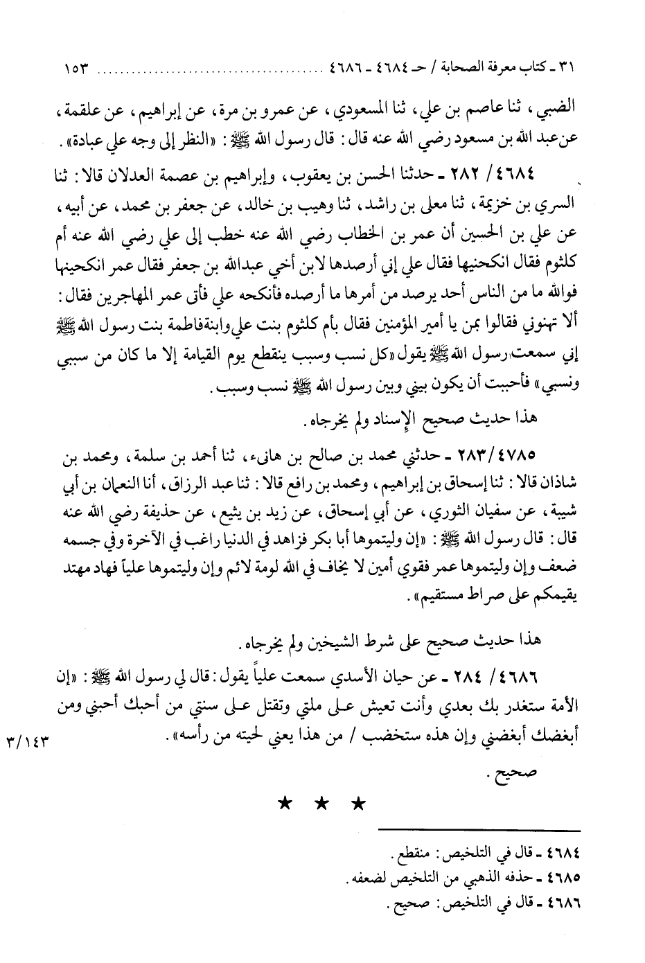 4685 - حَدَّثَنِي مُحَمَّدُ بْنُ صَالِحِ بْنِ هَانِئٍ، ثنا أَحْمَدُ بْنُ سَلَمَةَ، وَمُحَمَّدُ بْنُ شَاذَانَ، قَالَا: ثنا إِسْحَاقُ بْنُ إِبْرَاهِيمَ، وَمُحَمَّدُ بْنُ رَافِعٍ، قَالَا: ثنا عَبْدُ الرَّزَّاقِ، أَنَا النُّعْمَانُ بْنُ أَبِي شَيْبَةَ، عَنْ سُفْيَانَ الثَّوْرِيِّ، عَنْ أَبِي إِسْحَاقَ، عَنْ زَيْدِ بْنِ يُثَيْعٍ، عَنْ حُذَيْفَةَ رَضِيَ اللَّهُ عَنْهُ قَالَ: قَالَ رَسُولُ اللَّهِ صَلَّى اللهُ عَلَيْهِ وَسَلَّمَ: «§إِنْ وَلَّيْتُمُوهَا أَبَا بَكْرٍ فَزَاهِدٌ فِي الدُّنْيَا، رَاغِبٌ فِي الْآخِرَةِ، وَفِي جِسْمِهِ ضَعْفٌ، وَإِنْ وَلَّيْتُمُوهَا عُمَرُ فَقِوِيُّ أَمِينٌ، لَا يَخَافُ فِي اللَّهِ لَوْمَةَ لَائِمٍ، وَإِنْ وَلَّيْتُمُوهَا عَلِيًّا فَهَادٍ مُهْتَدٍ، يُقِيمُكُمْ عَلَى صِرَاطٍ مُسْتَقِيمٍ» هَذَا حَدِيثٌ صَحِيحٌ عَلَى شَرْطِ الشَّيْخَيْنِ، وَلَمْ يُخَرِّجَاهُ "K4685 - حذفه الذهبي من التلخيص لضعفه