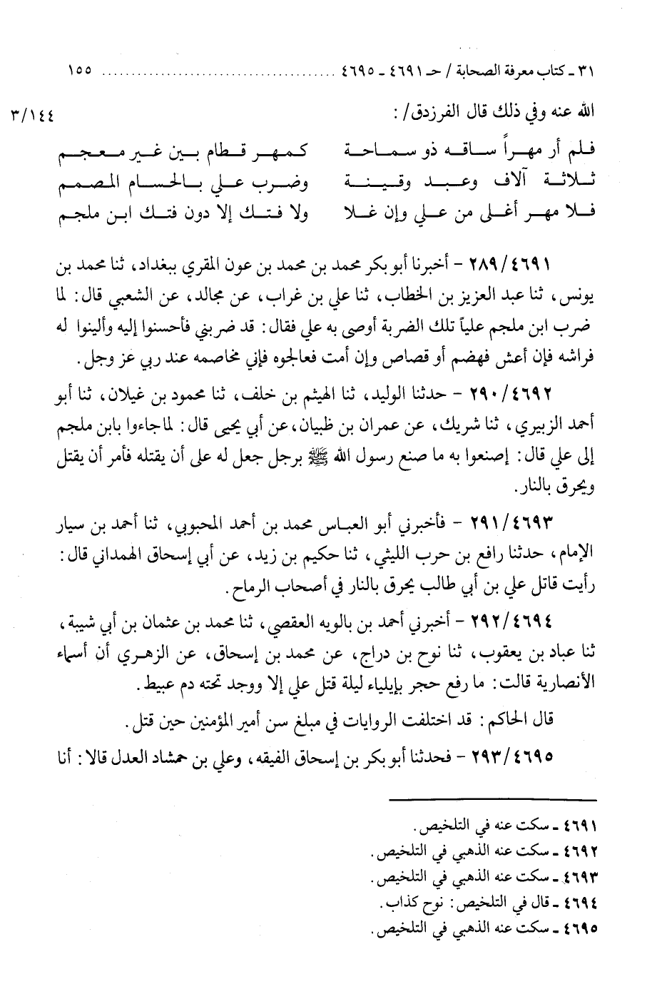 4691 - أَخْبَرَنَا أَبُو بَكْرٍ مُحَمَّدُ بْنُ مُحَمَّدِ بْنِ عَوْنٍ الْمُقْرِئُ، بِبَغْدَادَ، ثنا مُحَمَّدُ بْنُ يُونُسَ، ثنا عَبْدُ الْعَزِيزِ بْنُ الْخَطَّابِ، ثنا عَلِيُّ بْنُ غُرَابٍ، عَنْ مُجَالِدٍ، عَنِ الشَّعْبِيِّ قَالَ: لَمَّا ضَرَبَ ابْنُ مُلْجَمٍ عَلِيًّا تِلْكَ الضَّرْبَةَ أَوْصَى بِهِ عَلِيٌّ فَقَالَ: «§قَدْ ضَرَبَنِي فَأَحْسِنُوا إِلَيْهِ، وَأَلْينُوا لَهُ فِرَاشَهُ، فَإِنْ أَعِشْ فَهَضْمٌ أَوْ قِصَاصٌ، وَإِنْ أَمُتْ فَعَالِجُوهُ، فَإِنِّي مُخَاصِمُهُ عِنْدَ رَبِّي عَزَّ وَجَلَّ» K4691 - سكت عنه الذهبي في التلخيص