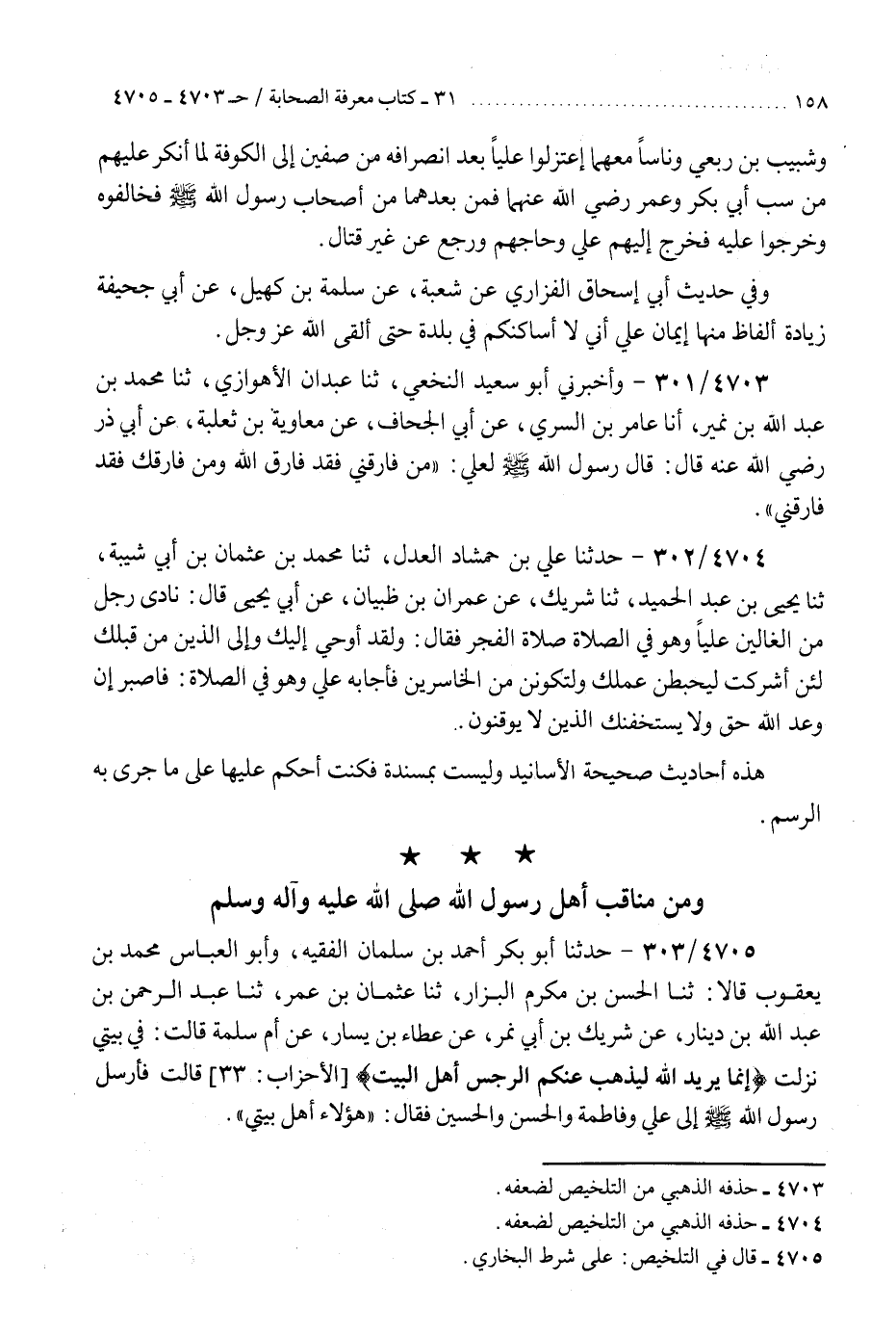 4704 - حَدَّثَنَا عَلِيُّ بْنُ حَمْشَاذَ الْعَدْلُ، ثنا مُحَمَّدُ بْنُ عُثْمَانَ بْنِ أَبِي شَيْبَةَ، ثنا يَحْيَى بْنُ عَبْدِ الْحَمِيدِ، ثنا شَرِيكٌ، عَنْ عِمْرَانَ بْنِ ظَبْيَانَ، عَنْ أَبِي يَحْيَى قَالَ: نَادَى رَجُلٌ مِنَ الْغَالِينَ عَلِيًّا وَهُوَ فِي الصَّلَاةِ صَلَاةِ الْفَجْرِ، فَقَالَ: {وَلَقَدْ أُوحِيَ إِلَيْكَ وَإِلَى الَّذِينَ مِنْ قَبْلِكَ لَئِنْ أَشْرَكْتَ لَيَحْبَطَنَّ عَمَلُكَ وَلَتَكُونَنَّ مِنَ الْخَاسِرِينَ} [الزمر: 65] ، فَأَجَابَهُ عَلِيٌّ وَهُوَ فِي الصَّلَاةِ: " {§فَاصْبِرْ إِنَّ وَعْدَ اللَّهِ حَقٌّ، وَلَا يَسْتَخِفَّنَّكَ الَّذِينَ لَا يُوقِنُونَ} [الروم: 60] «هَذِهِ أَحَادِيثُ صَحِيحَةُ الْأَسَانِيدِ وَلَيْسَتْ بِمُسْنَدَةٍ فَكُنْتُ أَحْكُمُ عَلَيْهَا عَلَى مَا جَرَى بِهِ الرَّسْمُ» K4704 - حذفه الذهبي من التلخيص لضعفه