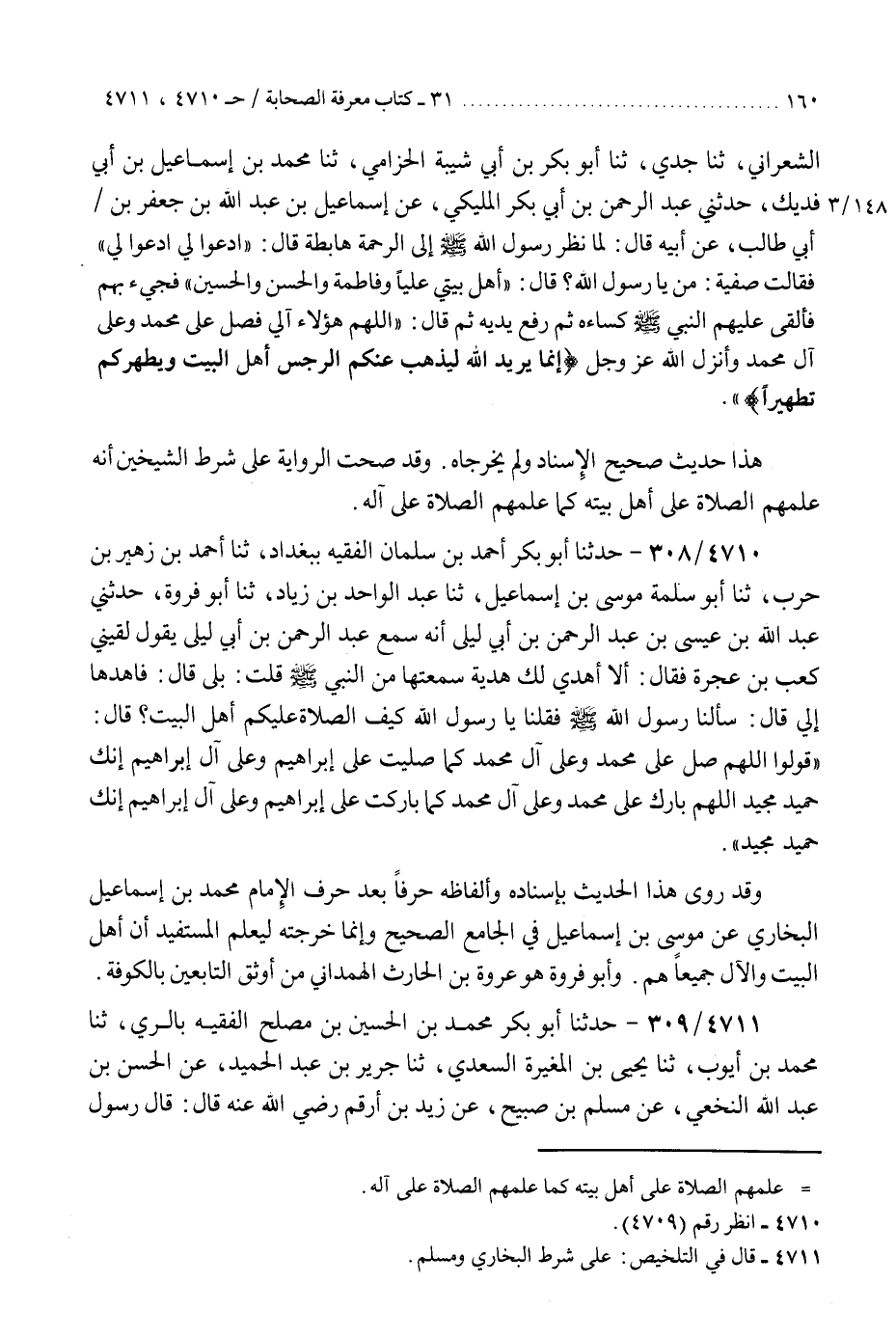4710 - حَدَّثَنَا أَبُو بَكْرٍ أَحْمَدُ بْنُ سَلْمَانَ الْفَقِيهُ، بِبَغْدَادَ، ثنا أَحْمَدُ بْنُ زُهَيْرِ بْنِ حَرْبٍ، ثنا أَبُو سَلَمَةَ مُوسَى بْنُ إِسْمَاعِيلَ، ثنا عَبْدُ الْوَاحِدِ بْنُ زِيَادٍ، ثنا أَبُو فَرْوَةَ، حَدَّثَنِي عَبْدُ اللَّهِ بْنُ عِيسَى بْنِ عَبْدِ الرَّحْمَنِ بْنِ أَبِي لَيْلَى، أَنَّهُ سَمِعَ عَبْدَ الرَّحْمَنِ بْنَ أَبِي لَيْلَى يَقُولُ: لَقِيَنِي كَعْبُ بْنُ عُجْرَةَ فَقَالَ: أَلَا أُهْدِي لَكَ هَدِيَّةً سَمِعْتُهَا مِنَ النَّبِيِّ صَلَّى اللهُ عَلَيْهِ وَسَلَّمَ؟ قُلْتُ: بَلَى، قَالَ: فَاهْدِهَا إِلَيَّ، قَالَ: سَأَلْنَا رَسُولُ اللَّهِ صَلَّى اللهُ عَلَيْهِ وَسَلَّمَ فَقُلْنَا: يَا رَسُولَ اللَّهِ، كَيْفَ الصَّلَاةُ عَلَيْكُمْ أَهْلَ الْبَيْتِ، قَالَ: «§قُولُوا اللَّهُمَّ صَلِّ عَلَى مُحَمَّدٍ وَعَلَى آلِ مُحَمَّدٍ، كَمَا صَلَّيْتَ عَلَى إِبْرَاهِيمَ وَعَلَى آلِ إِبْرَاهِيمَ، إِنَّكَ حُمَيْدٌ مَجِيدٌ، اللَّهُمَّ بَارِكْ عَلَى مُحَمَّدٍ وَعَلَى آلِ مُحَمَّدٍ، كَمَا بَارَكْتَ عَلَى إِبْرَاهِيمَ وَعَلَى آلِ إِبْرَاهِيمَ، إِنَّكَ حَمِيدٌ مَجِيدٌ» وَقَدْ رَوَى هَذَا الْحَدِيثَ بِإِسْنَادِهِ وَأَلْفَاظِهِ حَرْفًا بَعْدَ حَرْفٍ الْإِمَامُ مُحَمَّدُ بْنُ إِسْمَاعِيلَ الْبُخَارِيُّ، عَنْ مُوسَى بْنِ إِسْمَاعِيلَ فِي الْجَامِعِ الصَّحِيحِ، وَإِنَّمَا خَرَّجْتُهُ لِيَعْلَمَ الْمُسْتَفِيدُ أَنَّ أَهْلَ الْبَيْتِ وَالْآلَ جَمِيعًا هُمْ. وَأَبُو فَرْوَةَ وَعُرْوَةُ بْنُ الْحَارِثِ الْهَمْدَانِيُّ مِنْ أَوْثَقِ التَّابِعِينَ بِالْكُوفَةِ"