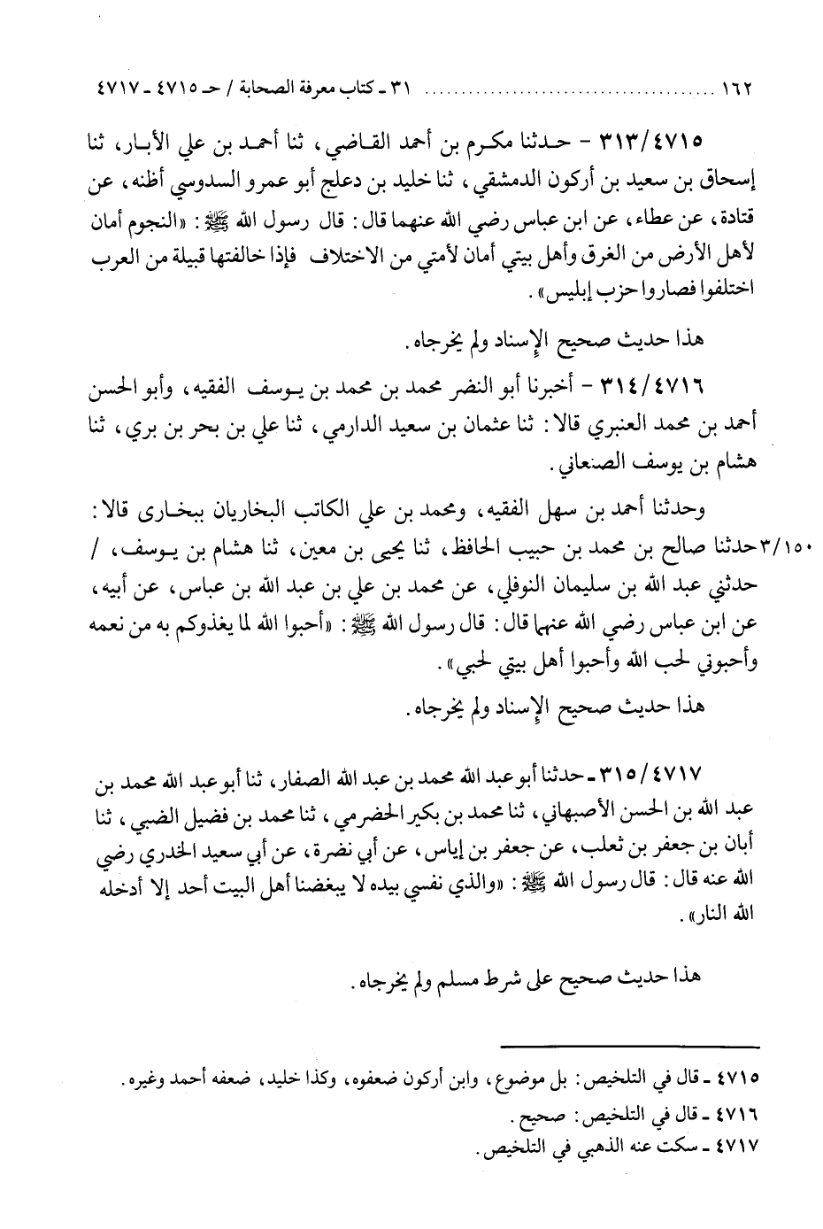 4717 - حَدَّثَنَا أَبُو عَبْدِ اللَّهِ مُحَمَّدُ بْنُ عَبْدِ اللَّهِ الصَّفَّارُ، ثنا أَبُو عَبْدِ اللَّهِ مُحَمَّدُ بْنُ عَبْدِ اللَّهِ بْنِ الْحَسَنِ الْأَصْبَهَانِيُّ، ثنا مُحَمَّدُ بْنُ بُكَيْرٍ الْحَضْرَمِيُّ، ثنا مُحَمَّدُ بْنُ فُضَيْلٍ الضَّبِّيُّ، ثنا أَبَانُ بْنُ جَعْفَرِ بْنِ ثَعْلَبٍ، عَنْ جَعْفَرِ بْنِ إِيَاسٍ، عَنْ أَبِي نَضْرَةَ، عَنْ أَبِي سَعِيدٍ الْخُدْرِيِّ رَضِيَ اللَّهُ عَنْهُ قَالَ: قَالَ رَسُولُ اللَّهِ صَلَّى اللهُ عَلَيْهِ وَسَلَّمَ: §«وَالَّذِي نَفْسِي بِيَدِهِ لَا يَبْغَضُنَا أَهْلَ الْبَيْتِ أَحَدٌ إِلَّا أَدْخَلَهُ اللَّهُ النَّارَ» هَذَا حَدِيثٌ صَحِيحٌ عَلَى شَرْطِ مُسْلِمٍ وَلَمْ يُخَرِّجَاهُ "K4717 - سكت عنه الذهبي في التلخيص
