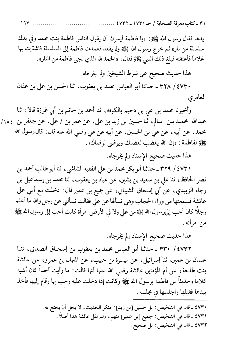 4730 - حَدَّثَنَا أَبُو الْعَبَّاسِ مُحَمَّدُ بْنُ يَعْقُوبَ، ثنا الْحَسَنُ بْنُ عَلِيِّ بْنِ عَفَّانَ الْعَامِرِيُّ، وَأَخْبَرَنَا مُحَمَّدُ بْنُ عَلِيِّ بْنِ دُحَيْمٍ، بِالْكُوفَةِ، ثنا أَحْمَدُ بْنُ حَازِمِ بْنِ أَبِي غَرَزَةَ، قَالَا: ثنا عَبْدُ اللَّهِ بْنُ مُحَمَّدِ بْنِ سَالِمٍ، ثنا حُسَيْنُ بْنُ زَيْدِ بْنِ عَلِيٍّ، عَنْ عُمَرَ بْنِ عَلِيٍّ، عَنْ جَعْفَرِ بْنِ مُحَمَّدٍ، عَنْ أَبِيهِ، عَنْ عَلِيِّ بْنِ الْحُسَيْنِ، عَنْ أَبِيهِ، عَنْ عَلِيٍّ رَضِيَ اللَّهُ عَنْهُ قَالَ: قَالَ رَسُولُ اللَّهِ صَلَّى اللهُ عَلَيْهِ وَسَلَّمَ لِفَاطِمَةَ: «إِنَّ §اللَّهَ يَغْضَبُ لِغَضَبِكِ وَيَرْضَى لِرَضَاكِ» هَذَا حَدِيثٌ صَحِيحُ الْإِسْنَادِ، وَلَمْ يُخَرِّجَاهُ "K4730 - بل حسين بن زيد منكر الحديث