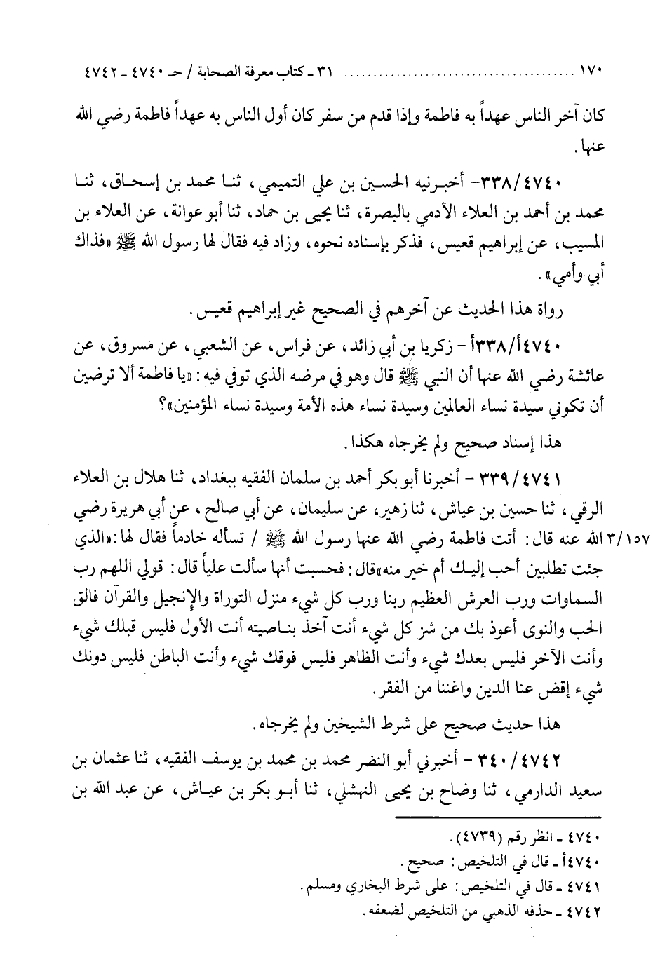 4740 - زَكَرِيَّا بْنُ أَبِي زَائِدٍ، عَنْ فِرَاسٍ، عَنِ الشَّعْبِيِّ، عَنْ مَسْرُوقٍ، عَنْ عَائِشَةَ، رَضِيَ اللَّهُ عَنْهَا أَنَّ النَّبِيَّ صَلَّى اللهُ عَلَيْهِ وَسَلَّمَ، قَالَ: وَهُوَ فِي مَرَضِهِ الَّذِي تُوُفِّيَ فِيهِ: «يَا فَاطِمَةُ، §أَلَا تَرْضَيْنَ أَنْ تَكُونِي سَيِّدَةَ نِسَاءِ الْعَالَمِينَ وَسَيِّدَةَ نِسَاءِ هَذِهِ الْأُمَّةِ وَسَيِّدَةَ نِسَاءِ الْمُؤْمِنِينَ؟» هَذَا إِسْنَادٌ صَحِيحٌ، وَلَمْ يُخَرِّجَاهُ هَكَذَا