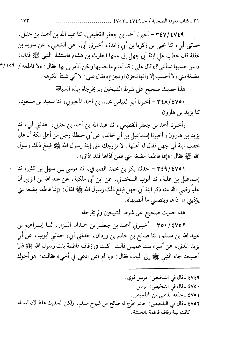 4749 - أَخْبَرَنَا أَحْمَدُ بْنُ جَعْفَرٍ الْقَطِيعِيُّ، ثنا عَبْدُ اللَّهِ بْنُ أَحْمَدَ بْنِ حَنْبَلٍ، حَدَّثَنِي أَبِي، ثنا يَحْيَى بْنُ زَكَرِيَّا بْنُ أَبِي زَائِدَةَ، أَخْبَرَنِي أَبِي، عَنِ الشَّعْبِيِّ، عَنْ سُوَيْدِ بْنِ غَفَلَةَ، قَالَ: خَطَبَ عَلِيٌّ ابْنَةَ أَبِي جَهْلٍ إِلَى عَمِّهَا الْحَارِثِ بْنِ هِشَامٍ فَاسْتَشَارَ النَّبِيَّ صَلَّى اللهُ عَلَيْهِ وَسَلَّمَ، فَقَالَ: «أَعَنْ حَسَبِهَا تَسْأَلُنِي؟» قَالَ: عَلِيٌّ قَدْ أَعْلَمُ مَا حَسَبُهَا وَلَكِنْ أَتَأْمُرُنِي بِهَا؟ فَقَالَ: «§لَا، فَاطِمَةُ مُضْغَةٌ مِنِّي، وَلَا أَحْسِبُ إِلَّا وَأَنَّهَا تَحْزَنُ أَوْ تَجْزَعُ» فَقَالَ عَلِيٌّ: لَا آتِي شَيْئًا تَكْرَهُهُ هَذَا حَدِيثٌ صَحِيحٌ عَلَى شَرْطِ الشَّيْخَيْنِ، وَلَمْ يُخَرِّجَاهُ بِهَذِهِ السِّيَاقَةِK4749 - مرسل قوي