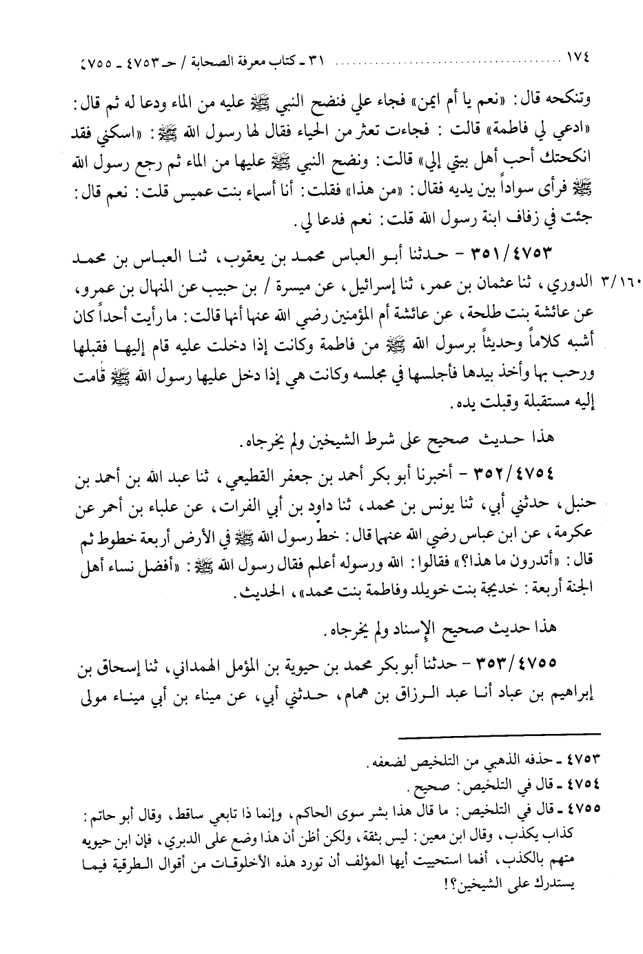 4753 - حَدَّثَنَا أَبُو الْعَبَّاسِ مُحَمَّدُ بْنُ يَعْقُوبَ، ثنا الْعَبَّاسُ بْنُ مُحَمَّدٍ الدُّورِيُّ، ثنا عُثْمَانُ بْنُ عُمَرَ، ثنا إِسْرَائِيلُ، عَنْ مَيْسَرَةَ بْنِ حَبِيبٍ، عَنِ الْمِنْهَالِ بْنِ عَمْرٍو، عَنْ عَائِشَةَ بِنْتِ طَلْحَةَ، عَنْ عَائِشَةَ أُمِّ الْمُؤْمِنِينَ رَضِيَ اللَّهُ عَنْهَا أَنَّهَا قَالَتْ: §«مَا رَأَيْتُ أَحَدًا كَانَ أَشْبَهَ كَلَامًا وَحَدِيثًا بِرَسُولِ اللَّهِ صَلَّى اللهُ عَلَيْهِ وَسَلَّمَ مِنْ فَاطِمَةَ، وَكَانَتْ إِذَا دَخَلَتْ عَلَيْهِ قَامَ إِلَيْهَا فَقَبَّلَهَا وَرَحَّبَ بِهَا وَأَخَذَ بِيَدِهَا فَأَجْلَسَهَا فِي مَجْلِسِهِ، وَكَانَتْ هِيَ إِذَا دَخَلَ عَلَيْهَا رَسُولُ اللَّهِ صَلَّى اللهُ عَلَيْهِ وَسَلَّمَ قَامَتْ إِلَيْهِ مُسْتَقْبِلَةً وَقَبَّلَتْ يَدَهُ» هَذَا حَدِيثٌ صَحِيحٌ عَلَى شَرْطِ الشَّيْخَيْنِ وَلَمْ يُخَرِّجَاهُ "K4753 - حذفه الذهبي من التلخيص لضعفه