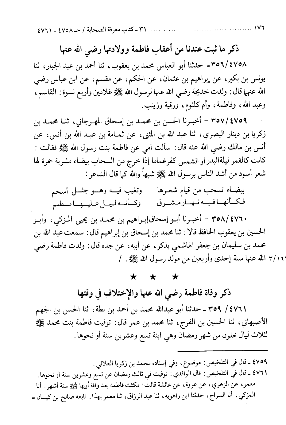 4760 - أَخْبَرَنَا أَبُو إِسْحَاقَ إِبْرَاهِيمُ بْنُ مُحَمَّدِ بْنِ يَحْيَى الْمُزَكِّي، وَأَبُو الْحُسَيْنِ بْنُ يَعْقُوبَ الْحَافِظُ قَالَا: ثنا مُحَمَّدُ بْنُ إِسْحَاقَ بْنِ إِبْرَاهِيمَ، قَالَ: سَمِعْتُ عَبْدَ اللَّهِ بْنَ مُحَمَّدِ بْنِ سُلَيْمَانَ بْنِ جَعْفَرٍ الْهَاشِمِيَّ يَذْكُرُ، عَنْ أَبِيهِ، عَنْ جَدِّهِ قَالَ: §«وُلِدَتْ فَاطِمَةُ رَضِيَ اللَّهُ عَنْهَا سَنَةَ إِحْدَى وَأَرْبَعِينَ مِنْ مَوْلِدِ رَسُولِ اللَّهِ صَلَّى اللهُ عَلَيْهِ وَسَلَّمَ»