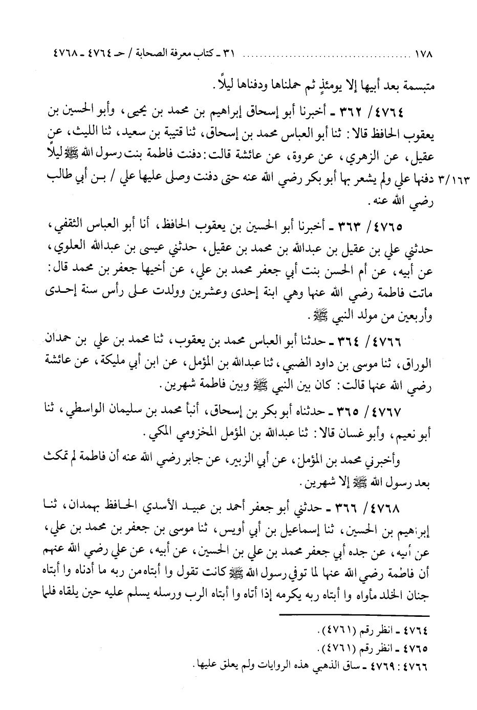 4764 - أَخْبَرَنَا أَبُو إِسْحَاقَ إِبْرَاهِيمُ بْنُ مُحَمَّدِ بْنِ يَحْيَى، وَأَبُو الْحُسَيْنِ بْنُ يَعْقُوبَ الْحَافِظُ قَالَا: ثنا أَبُو الْعَبَّاسِ مُحَمَّدُ بْنُ إِسْحَاقَ، ثنا قُتَيْبَةُ بْنُ سَعِيدٍ، ثنا اللَّيْثُ، عَنْ عَقِيلٍ، عَنِ الزُّهْرِيِّ، عَنْ عُرْوَةَ، عَنْ عَائِشَةَ قَالَتْ: §«دُفِنَتْ فَاطِمَةُ بِنْتُ رَسُولِ اللَّهِ صَلَّى اللهُ عَلَيْهِ وَسَلَّمَ لَيْلًا دَفَنَهَا عَلِيٌّ، وَلَمْ يَشْعُرْ بِهَا أَبُو بَكْرٍ رَضِيَ اللَّهُ عَنْهُ حَتَّى دُفِنَتْ وَصَلَّى عَلَيْهَا عَلِيُّ بْنُ أَبِي طَالِبٍ رَضِيَ اللَّهُ عَنْهُ»