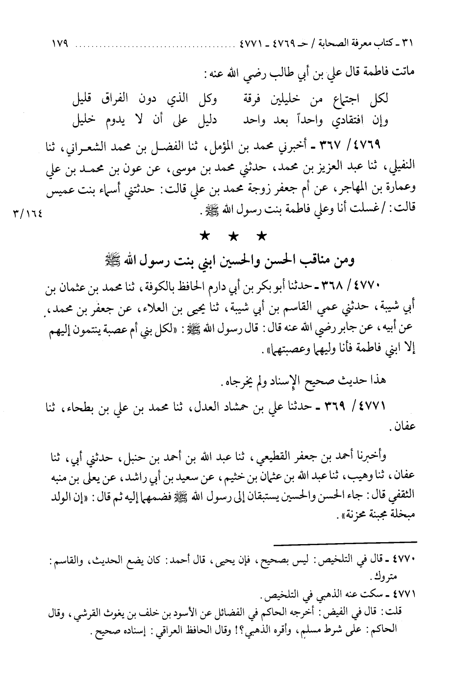 4770 - حَدَّثَنَا أَبُو بَكْرِ بْنُ أَبِي دَارِمٍ الْحَافِظُ بِالْكُوفَةِ، ثنا مُحَمَّدُ بْنُ عُثْمَانَ بْنِ أَبِي شَيْبَةَ، حَدَّثَنِي عَمِّي الْقَاسِمُ بْنُ أَبِي شَيْبَةَ، ثنا يَحْيَى بْنُ الْعَلَاءِ، عَنْ جَعْفَرِ بْنِ مُحَمَّدٍ، عَنْ أَبِيهِ، عَنْ جَابِرٍ رَضِيَ اللَّهُ عَنْهُ قَالَ: قَالَ رَسُولُ اللَّهِ صَلَّى اللهُ عَلَيْهِ وَسَلَّمَ: «§لِكُلِّ بَنِي أُمِّ عَصَبَةٌ يَنْتَمُونَ إِلَيْهِمْ إِلَّا ابْنَيْ فَاطِمَةَ، فَأَنَا وَلِيُّهُمَا وَعَصَبَتُهُمَا» هَذَا حَدِيثٌ صَحِيحُ الْإِسْنَادِ وَلَمْ يُخَرِّجَاهُ "K4770 - ليس بصحيح