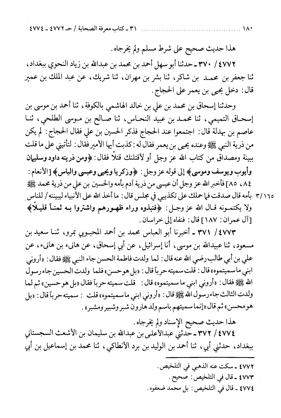 4772 - حَدَّثَنَا أَبُو سَهْلٍ أَحْمَدُ بْنُ مُحَمَّدِ بْنِ عَبْدِ اللَّهِ بْنِ زِيَادٍ النَّحْوِيُّ بِبَغْدَادَ، ثنا جَعْفَرُ بْنُ مُحَمَّدِ بْنِ شَاكِرٍ، ثنا بِشْرُ بْنُ مِهْرَانَ، ثنا شَرِيكٌ، عَنْ عَبْدِ الْمَلِكِ بْنِ عُمَيْرٍ، قَالَ: دَخَلَ يَحْيَى بْنُ يَعْمَرَ عَلَى الْحَجَّاجِ، وَحَدَّثَنَا إِسْحَاقُ بْنُ مُحَمَّدِ بْنِ عَلِيِّ بْنِ خَالِدِ الْهَاشِمِيِّ بِالْكُوفَةِ، ثنا أَحْمَدُ بْنُ مُوسَى بْنِ إِسْحَاقَ التَّمِيمِيُّ، ثنا مُحَمَّدُ بْنُ عُبَيْدِ النَّحَّاسُ، ثنا صَالِحُ بْنُ مُوسَى الطَّلْحِيُّ، ثنا عَاصِمُ بْنُ بَهْدَلَةَ، قَالَ: اجْتَمَعُوا عِنْدَ الْحَجَّاجِ فَذَكَرَ الْحُسَيْنَ بْنَ عَلِيٍّ، فَقَالَ الْحَجَّاجُ: لَمْ يَكُنْ مِنْ ذُرِّيَّةِ النَّبِيِّ صَلَّى اللهُ عَلَيْهِ وَسَلَّمَ وَعِنْدَهُ يَحْيَى بْنُ يَعْمَرَ، فَقَالَ لَهُ: «كَذَبْتَ أَيُّهَا الْأَمِيرُ» ، فَقَالَ: لَتَأْتِيَنِّي عَلَى مَا قُلْتَ بِبَيِّنَةٍ وَمِصْدَاقٍ مِنْ كِتَابِ اللَّهِ عَزَّ وَجَلَّ أَوْ لَأَقْتُلَنَّكَ قَتْلًا، فَقَالَ: " {وَمِنْ ذُرِّيَّتِهِ دَاوُدَ وَسُلَيْمَانَ وَأَيُّوبَ وَيُوسُفَ وَمُوسَى} إِلَى قَوْلِهِ عَزَّ وَجَلَّ {وَزَكَرِيَّا وَيَحْيَى وَعِيسَى وَإِلْيَاسَ} [الأنعام: 85] فَأَخْبَرَ اللَّهُ عَزَّ وَجَلَّ أَنَّ §عِيسَى مِنْ ذُرِّيَّةِ آدَمَ بِأُمِّهِ وَالْحُسَيْنُ بْنُ عَلِيٍّ مِنْ ذُرِّيَّةِ مُحَمَّدٍ صَلَّى اللهُ عَلَيْهِ وَسَلَّمَ بِأُمِّهِ "، قَالَ: صَدَقْتَ، فَمَا حَمَلَكَ عَلَى تَكْذِيبِي فِي مَجْلِسٍ، قَالَ: " مَا أَخَذَ اللَّهُ عَلَى الْأَنْبِيَاءِ لَيُبَيِّنُنَّهُ لِلنَّاسِ وَلَا يَكْتُمُونَهُ، قَالَ اللَّهُ عَزَّ وَجَلَّ: {فَنَبَذُوهُ وَرَاءَ ظُهُورِهِمْ وَاشْتَرُوا بِهِ ثَمَنًا قَلِيلًا} [آل عمران: 187] " قَالَ: فَنَفَاهُ إِلَى خُرَاسَانَK4772 - سكت عنه الذهبي في التلخيص
