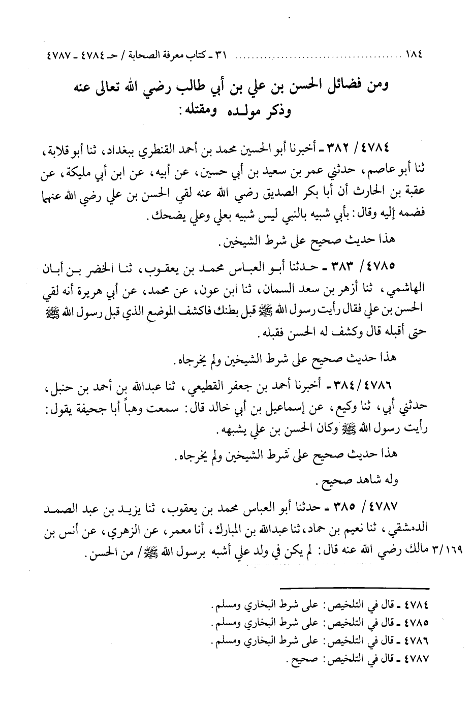 4787 - حَدَّثَنَا أَبُو الْعَبَّاسِ مُحَمَّدُ بْنُ يَعْقُوبَ، ثنا يَزِيدُ بْنُ عَبْدِ الصَّمَدِ الدِّمَشْقِيُّ، ثنا نُعَيْمُ بْنُ حَمَّادٍ، ثنا عَبْدُ اللَّهِ بْنُ الْمُبَارَكِ، أَنَا مَعْمَرٌ، عَنِ الزُّهْرِيِّ، عَنْ أَنَسِ بْنِ مَالِكٍ رَضِيَ اللَّهُ عَنْهُ قَالَ: §«لَمْ يَكُنْ فِي وَلَدِ عَلِيٍّ أَشْبَهُ بِرَسُولِ اللَّهِ صَلَّى اللهُ عَلَيْهِ وَسَلَّمَ مِنَ الْحَسَنِ» K4787 - صحيح