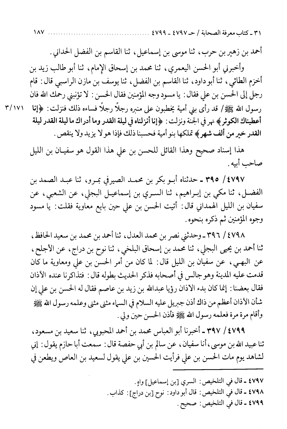 4798 - وَحَدَّثَنِي نَصْرُ بْنُ مُحَمَّدٍ الْعَدْلُ، ثنا أَحْمَدُ بْنُ مُحَمَّدِ بْنِ سَعِيدٍ الْحَافِظُ، ثنا أَحْمَدُ بْنُ يَحْيَى الْبَجَلِيُّ، ثنا مُحَمَّدُ بْنُ إِسْحَاقَ الْبَلْخِيُّ، ثنا نُوحُ بْنُ دَرَّاجٍ، عَنِ الْأَجْلَحِ، عَنِ الْبَهِيِّ، عَنْ سُفْيَانَ بْنِ اللَّيْلِ، قَالَ: لَمَّا كَانَ مِنْ أَمْرِ الْحَسَنِ بْنِ عَلِيٍّ وَمُعَاوِيَةَ مَا كَانَ قَدِمْتُ عَلَيْهِ الْمَدِينَةَ وَهُوَ جَالِسٌ فِي أَصْحَابِهِ، - فَذَكَرَ الْحَدِيثَ بِطُولِهِ - قَالَ: فَتَذَاكَرْنَا عِنْدَهُ الْأَذَانَ فَقَالَ بَعْضُنَا: إِنَّمَا كَانَ بَدْءُ الْأَذَانِ رُؤْيَا عَبْدِ اللَّهِ بْنِ زَيْدِ بْنِ عَاصِمٍ، فَقَالَ لَهُ الْحَسَنُ بْنُ عَلِيٍّ: «إِنَّ §شَأْنَ الْأَذَانِ أَعْظَمُ مِنْ ذَاكَ، أَذَّنَ جِبْرِيلُ عَلَيْهِ السَّلَامُ فِي السَّمَاءِ مَثْنَى مَثْنَى، وَعَلَّمَهُ رَسُولَ اللَّهِ صَلَّى اللهُ عَلَيْهِ وَسَلَّمَ، وَأَقَامُ مَرَّةً مَرَّةً فَعَلَّمَهُ رَسُولَ اللَّهِ صَلَّى اللهُ عَلَيْهِ وَسَلَّمَ فَأَذَّنَ الْحَسَنُ حِينَ وَلِيَ» K4798 - قال أبو داود نوح بن دراج كذاب
