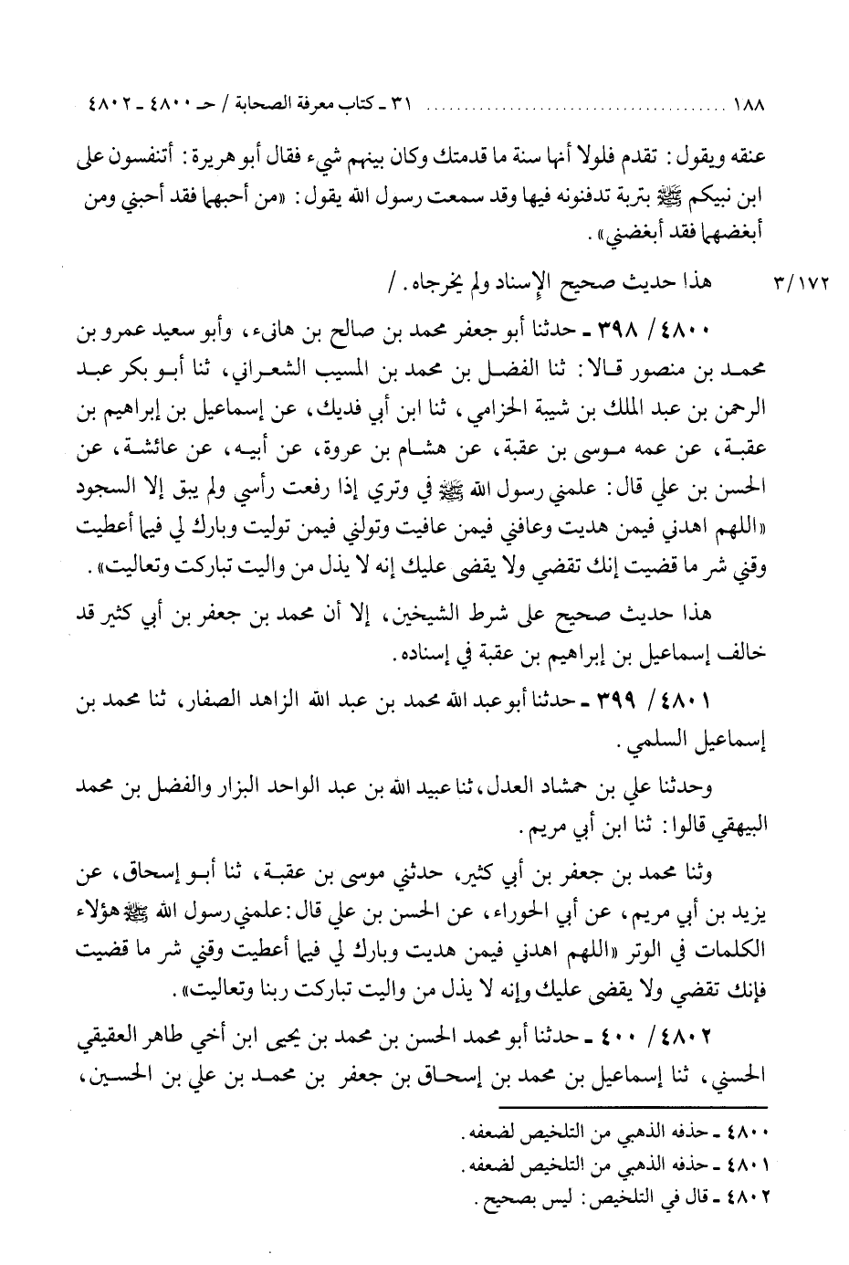 4801 - حَدَّثَنَا أَبُو عَبْدِ اللَّهِ مُحَمَّدُ بْنُ عَبْدِ اللَّهِ الزَّاهِدُ الصَّفَّارُ، ثنا مُحَمَّدُ بْنُ إِسْمَاعِيلَ السُّلَمِيُّ، وَحَدَّثَنَا عَلِيُّ بْنُ حَمْشَاذٍ الْعَدْلُ، ثنا عُبَيْدُ اللَّهِ بْنُ عَبْدِ الْوَاحِدِ الْبَزَّارُ، وَالْفَضْلُ بْنُ مُحَمَّدٍ الْبَيْهَقِيُّ قَالُوا: ثَنَا ابْنُ أَبِي مَرْيَمَ وَثَنَا مُحَمَّدُ بْنُ جَعْفَرِ بْنِ أَبِي كَثِيرٍ، حَدَّثَنِي مُوسَى بْنُ عُقْبَةَ، ثنا أَبُو إِسْحَاقَ، عَنْ يَزِيدَ بْنِ أَبِي مَرْيَمَ، عَنْ أَبِي الْحَوْرَاءِ، عَنِ الْحَسَنِ بْنِ عَلِيٍّ قَالَ: عَلَّمَنِي رَسُولُ اللَّهِ صَلَّى اللهُ عَلَيْهِ وَسَلَّمَ هَؤُلَاءِ الْكَلِمَاتِ فِي الْوِتْرِ: «§اللَّهُمَّ اهْدِنِي فِيمَنْ هَدَيْتَ، وَبَارِكْ لِي فِيمَا أَعْطَيْتَ، وَقِنِي شَرَّ مَا قَضَيْتَ، فَإِنَّكَ تَقْضِي وَلَا يُقْضَى عَلَيْكَ، وَإِنَّهُ لَا يَذِلُّ مَنْ وَالَيْتَ، تَبَارَكْتَ رَبَّنَا وَتَعَالَيْتَ» K4801 - حذفه الذهبي من التلخيص لضعفه