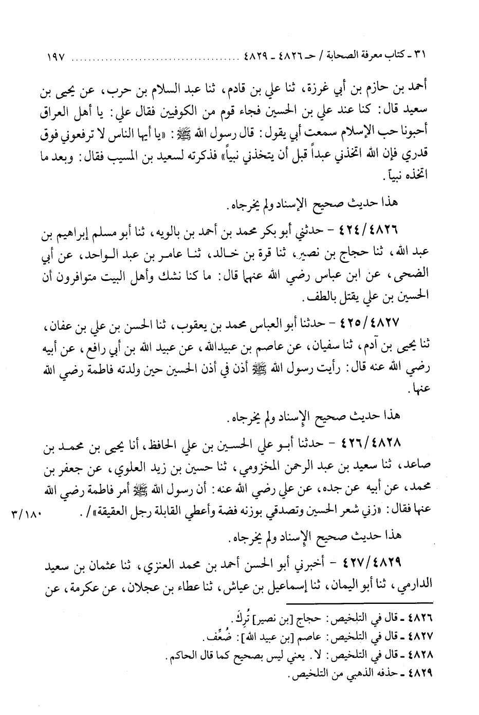 4826 - حَدَّثَنِي أَبُو بَكْرٍ مُحَمَّدُ بْنُ أَحْمَدَ بْنِ بَالَوَيْهِ، ثنا أَبُو مُسْلِمٍ إِبْرَاهِيمُ بْنُ عَبْدِ اللَّهِ، ثنا حَجَّاجُ بْنُ نُصَيْرٍ، ثنا قُرَّةُ بْنُ خَالِدٍ، ثنا عَامِرُ بْنُ عَبْدِ الْوَاحِدِ، عَنْ أَبِي الضُّحَى، عَنِ ابْنِ عَبَّاسٍ رَضِيَ اللَّهُ عَنْهُمَا قَالَ: §«مَا كُنَّا نَشُكُّ وَأَهْلُ الْبَيْتِ مُتَوَافِرُونَ أَنَّ الْحُسَيْنَ بْنَ عَلِيٍّ يُقْتَلُ بِالطَّفِّ» K4826 - حجاج بن نصير ترك