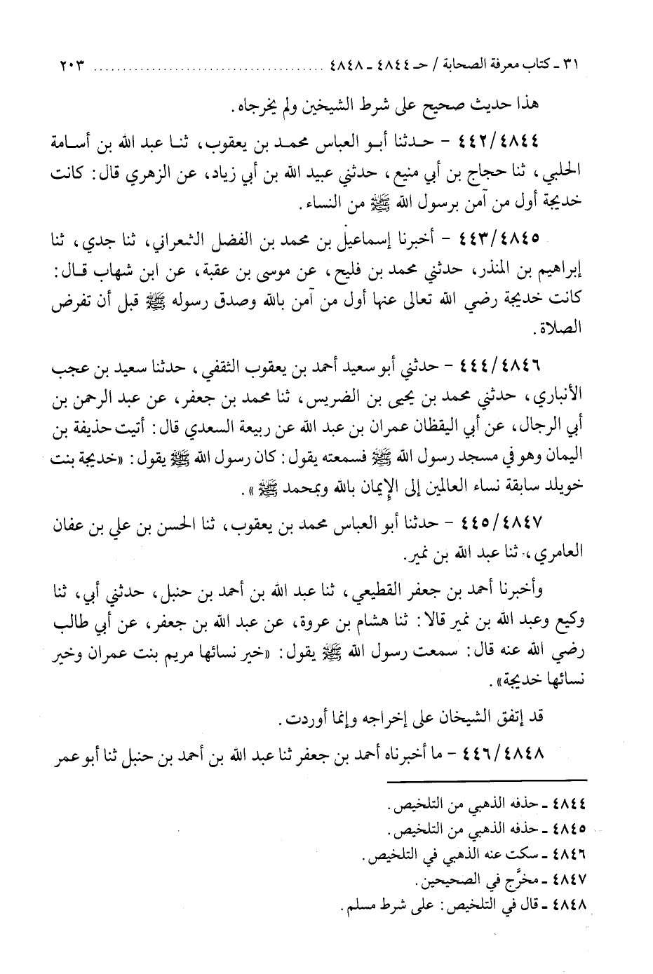 4845 - أَخْبَرَنَا إِسْمَاعِيلُ بْنُ مُحَمَّدِ بْنِ الْفَضْلِ الشَّعْرَانِيُّ، ثنا جَدِّي، ثنا إِبْرَاهِيمُ بْنُ الْمُنْذِرِ، حَدَّثَنِي مُحَمَّدُ بْنُ فُلَيْحٍ، عَنْ مُوسَى بْنِ عُقْبَةَ، عَنِ ابْنِ شِهَابٍ قَالَ: «كَانَتْ §خَدِيجَةُ رَضِيَ اللَّهُ عَنْهَا أَوَّلَ مَنْ آمَنَ بِاللَّهِ وَصَدَّقَ بِرَسُولِهِ صَلَّى اللهُ عَلَيْهِ وَسَلَّمَ قَبْلَ أَنْ تُفْرَضَ الصَّلَاةُ» K4845 - حذفه الذهبي من التلخيص لضعفه