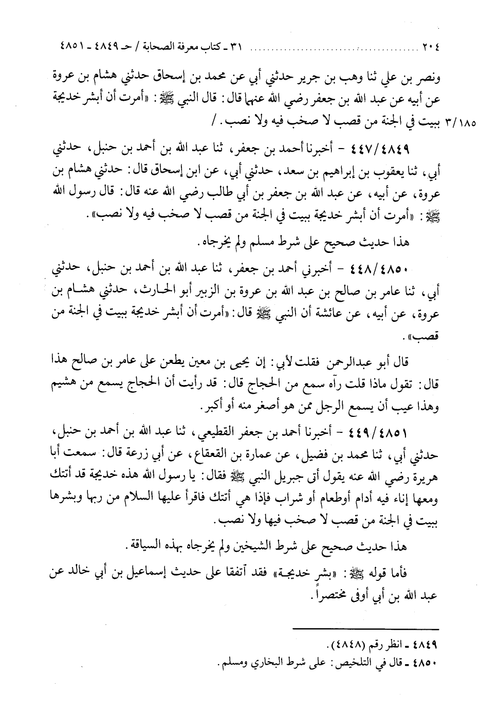 4850 - أَخْبَرَنِي أَحْمَدُ بْنُ جَعْفَرٍ، ثنا عَبْدُ اللَّهِ بْنُ أَحْمَدَ بْنِ حَنْبَلٍ، حَدَّثَنِي أَبِي، ثنا عَامِرُ بْنُ صَالِحِ بْنِ عَبْدِ اللَّهِ بْنِ عُرْوَةَ بْنِ الزُّبَيْرِ أَبُو الْحَارِثِ، حَدَّثَنِي هِشَامُ بْنُ عُرْوَةَ، عَنْ أَبِيهِ، عَنْ عَائِشَةَ، أَنَّ النَّبِيَّ صَلَّى اللهُ عَلَيْهِ وَسَلَّمَ قَالَ: §«أُمِرْتُ أَنْ أُبَشِّرَ خَدِيجَةَ بِبَيْتٍ فِي الْجَنَّةِ مِنْ قَصَبٍ» قَالَ أَبُو عَبْدِ الرَّحْمَنِ: فَقُلْتُ لِأَبِي: إِنَّ يَحْيَى بْنَ مَعِينٍ يَطْعُنُ عَلَى عَامِرِ بْنِ صَالِحٍ هَذَا، قَالَ: تَقُولُ مَاذَا؟ قُلْتَ: رَآهُ سَمِعَ مِنَ الْحَجَّاجِ، قَالَ: قَدْ رَأَيْتُ أَنَّ الْحَجَّاجَ يَسْمَعُ مِنْ هُشَيْمٍ، وَهَذَا عَيْبٌ أَنْ يَسْمَعَ الرَّجُلُ مِمَّنْ هُوَ أَصْغَرُ مِنْهُ أَوْ أَكْبَرُK4850 - على شرط البخاري ومسلم
