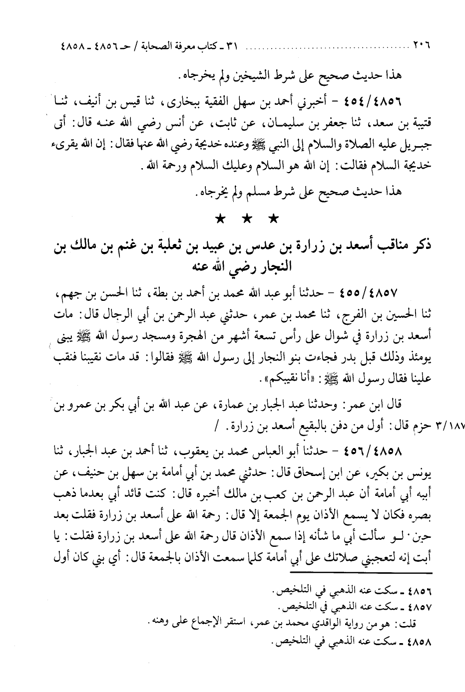 4857 - حَدَّثَنَا أَبُو عَبْدِ اللَّهِ مُحَمَّدُ بْنُ أَحْمَدَ بْنِ بَطَّةَ، ثنا الْحَسَنُ بْنُ جَهْمٍ، ثنا الْحُسَيْنُ بْنُ الْفَرَجِ، ثنا مُحَمَّدُ بْنُ عُمَرَ، حَدَّثَنِي عَبْدُ الرَّحْمَنِ بْنُ أَبِي الرِّجَالِ قَالَ: مَاتَ أَسْعَدُ بْنُ زُرَارَةَ فِي شَوَّالٍ عَلَى رَأْسِ تِسْعَةِ أَشْهُرٍ مِنَ الْهِجْرَةِ، وَمَسْجِدُ رَسُولِ اللَّهِ صَلَّى اللهُ عَلَيْهِ وَسَلَّمَ يُبْنَى يَوْمَئِذٍ؛ وَذَلِكَ قَبْلَ بَدْرٍ، فَجَاءَتْ بَنُو النَّجَّارِ إِلَى رَسُولِ اللَّهِ صَلَّى اللهُ عَلَيْهِ وَسَلَّمَ فَقَالُوا: قَدْ مَاتَ نَقِيبُنَا فَنَقِّبْ عَلَيْنَا، فَقَالَ رَسُولُ اللَّهِ صَلَّى اللهُ عَلَيْهِ وَسَلَّمَ: §«أَنَا نَقِيبُكُمْ» K4857 - سكت عنه الذهبي في التلخيص