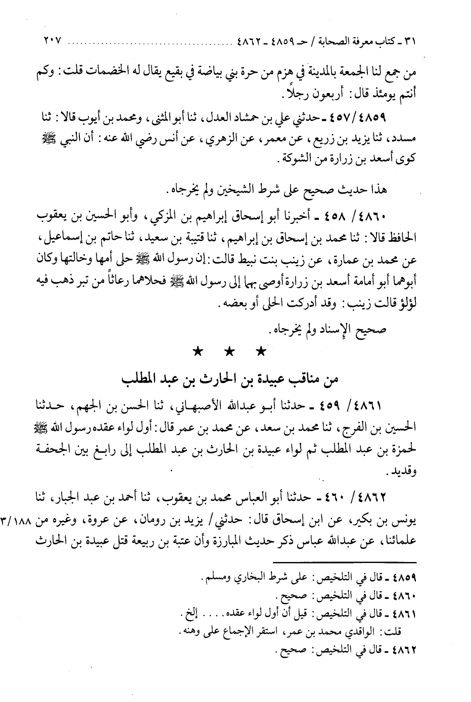 4862 - حَدَّثَنَا أَبُو الْعَبَّاسِ مُحَمَّدُ بْنُ يَعْقُوبَ، ثنا أَحْمَدُ بْنُ عَبْدِ الْجَبَّارِ، ثنا يُونُسُ بْنُ بُكَيْرٍ، عَنِ ابْنِ إِسْحَاقَ، قَالَ: حَدَّثَنِي يَزِيدُ بْنُ رُومَانَ، عَنْ عُرْوَةَ، وَغَيْرُهُ مِنْ عُلَمَائِنَا، عَنْ عَبْدِ اللَّهِ بْنِ عَبَّاسٍ ذَكَرَ حَدِيثَ الْمُبَارَزَةِ، وَأَنَّ عُتْبَةَ بْنَ رَبِيعَةَ قَتَلَ عُبَيْدَةَ بْنَ الْحَارِثِ مُبَارَزَةً، ضَرَبَهُ عُتْبَةُ عَلَى سَاقِهِ فَقَطَعَهَا، §«فَحَمَلَهُ رَسُولُ اللَّهِ صَلَّى اللهُ عَلَيْهِ وَسَلَّمَ فَمَاتَ بِالصَّفْرَاءِ مُنْصَرَفُهُ مِنْ بَدْرٍ فَدَفَنَهُ هُنَالِكَ» هَذَا حَدِيثٌ صَحِيحُ الْإِسْنَادِ، وَلَمْ يُخَرِّجَاهُ "K4862 - صحيح