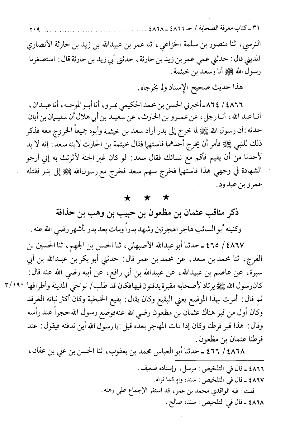 4866 - أَخْبَرَنِي الْحَسَنُ بْنُ مُحَمَّدٍ الْحَلِيمِيُّ بِمَرْوَ، أَنَا أَبُو الْمُوَجِّهِ، أَنَا عَبْدَانُ، أَنَا عَبْدُ اللَّهِ، أَنَا رَجُلٌ، عَنْ عَمْرِو بْنِ الْحَارِثِ، عَنْ سَعِيدِ بْنِ أَبِي هِلَالٍ، أَنَّ سُلَيْمَانَ بْنَ أَبَانَ حَدَّثَهُ، «أَنَّ رَسُولَ اللَّهِ صَلَّى اللهُ عَلَيْهِ وَسَلَّمَ لَمَّا خَرَجَ إِلَى بَدْرٍ أَرَادَ سَعْدَ بْنَ خَيْثَمَةَ وَأَبُوهُ جَمِيعًا الْخُرُوجَ مَعَهُ، فَذَكَرَ ذَلِكَ لِلنَّبِيِّ صَلَّى اللهُ عَلَيْهِ وَسَلَّمَ §فَأَمَرَ أَنْ يَخْرُجَ أَحَدُهُمَا فَاسْتَهَمَا» ، فَقَالَ خَيْثَمَةُ بْنُ الْحَارِثِ لِابْنِهِ سَعْدٍ: إِنَّهُ لَا بُدَّ لِأَحَدِنَا مِنْ أَنْ يُقِيمَ فَأَقِمْ مَعَ نِسَائِكَ، فَقَالَ سَعْدٌ: لَوْ كَانَ غَيْرُ الْجَنَّةِ لَآثَرْتُكَ بِهِ أَنِّي أَرْجُو الشَّهَادَةَ فِي وَجْهِي هَذَا، فَاسْتَهَمَا فَخَرَجَ سَهْمُ سَعْدٍ فَخَرَجَ مَعَ رَسُولِ اللَّهِ صَلَّى اللهُ عَلَيْهِ وَسَلَّمَ إِلَى بَدْرٍ، فَقَتَلَهُ عَمْرُو بْنُ عَبْدِ وَدٍّK4866 - مرسل وإسناده ضعيف