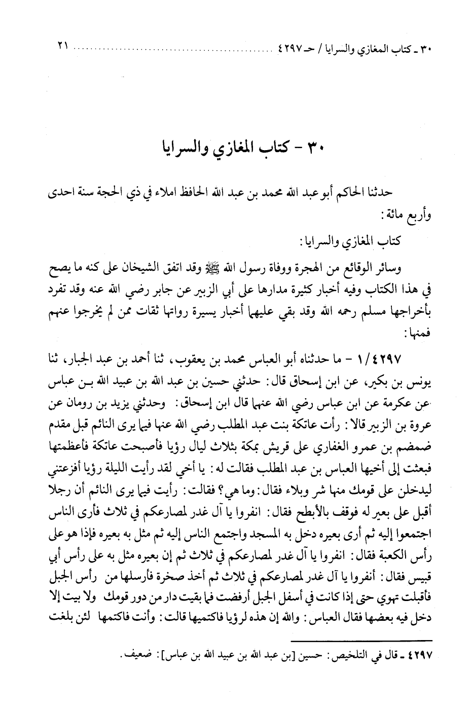 §كِتَابُ الْمَغَازِي وَالسَّرَايَا حَدَّثَنَا الْحَاكِمُ أَبُو عَبْدِ اللَّهِ مُحَمَّدُ بْنُ عَبْدِ اللَّهِ الْحَافِظُ إِمْلَاءً فِي ذِي الْحِجَّةِ سَنَةَ إِحْدَى وَأَرْبَعِ مِائَةٍ: كِتَابُ الْمَغَازِي وَالسَّرَايَا وَسَائِرِ الْوَقَائعِ مِنَ الْهِجْرَةِ وَوَفَاةِ رَسُولِ اللَّهِ صَلَّى اللهُ عَلَيْهِ وَسَلَّمَ، وَقَدِ اتَّفَقَ الشَّيْخَانِ عَلَى كُنْهِ مَا يَصِحُّ فِي هَذَا الْكِتَابِ، وَفِيهِ أَخْبَارٌ كَثِيرَةٌ مَدَارُهَا عَلَى أَبِي الزُّبَيْرِ، عَنْ جَابِرٍ رَضِيَ اللَّهُ عَنْهُ، وَقَدْ تَفَرَّدَ بِإِخْرَاجِهَا مُسْلِمٌ رَحْمَةُ اللَّهِ، وَقَدْ بَقِيَ عَلَيْهِمَا أَخْبَارٌ يَسِيرَةٌ، رُوَاتُهَا ثِقَاتٌ مِمَّنْ لَمْ يُخَرِّجُوا عَنْهُمْ فَمِنْهَا "