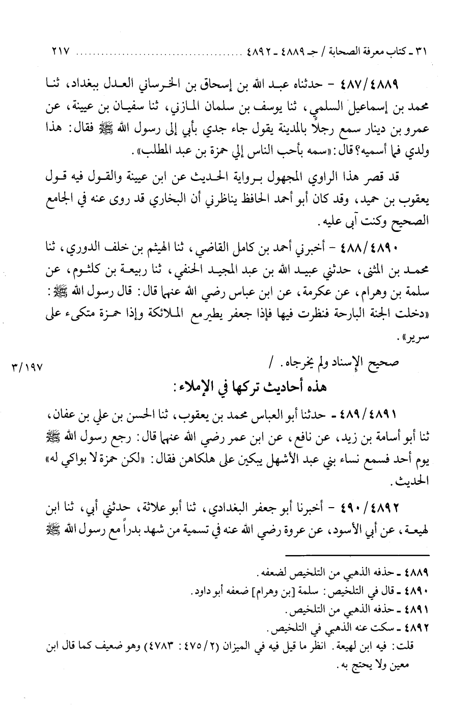 4889 - حَدَّثَنَاهُ عَبْدُ اللَّهِ بْنُ إِسْحَاقَ الْخُرَسَانِيُّ الْعَدْلُ بِبَغْدَادَ، ثنا مُحَمَّدُ بْنُ إِسْمَاعِيلَ السُّلَمِيُّ، ثنا يُوسُفُ بْنُ سَلْمَانَ الْمَازِنِيُّ، ثنا سُفْيَانُ بْنُ عُيَيْنَةَ، عَنْ عَمْرِو بْنِ دِينَارٍ، سَمِعَ رَجُلًا بِالْمَدِينَةِ يَقُولُ: جَاءَ جَدِّي بِأَبِي إِلَى رَسُولِ اللَّهِ صَلَّى اللهُ عَلَيْهِ وَسَلَّمَ، فَقَالَ: هَذَا وَلَدِي، فَمَا أُسَمِّيهِ؟ قَالَ: §«سَمِّهِ بِأَحَبِّ النَّاسِ إِلَيَّ حَمْزَةَ بْنِ عَبْدِ الْمُطَّلِبِ» قَدْ قَصَّرَ هَذَا الرَّاوِي الْمَجْهُولُ بِرِوَايَةِ الْحَدِيثِ عَنِ ابْنِ عُيَيْنَةَ، وَالْقَوْلُ فِيهِ قَوْلُ يَعْقُوبَ بْنِ حُمَيْدٍ، وَقَدْ كَانَ أَبُو أَحْمَدَ الْحَافِظُ يُنَاظِرُنِي أَنَّ الْبُخَارِيَّ قَدْ رَوَى عَنْهُ فِي الْجَامِعِ الصَّحِيحِ، وَكُنْتُ آبَى عَلَيْهِ "K4889 - حذفه الذهبي من التلخيص لضعفه