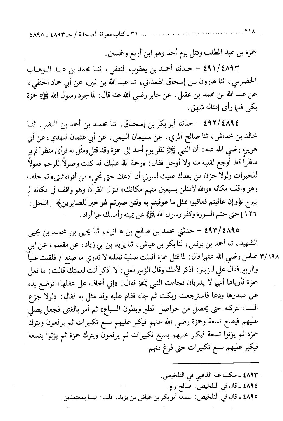 4893 - حَدَّثَنَا أَحْمَدُ بْنُ يَعْقُوبَ الثَّقَفِيُّ، ثنا مُحَمَّدُ بْنُ عَبْدِ الْوَهَّابِ الْحَضْرَمِيُّ، ثنا هَارُونُ بْنُ إِسْحَاقَ الْهَمْدَانِيُّ، ثنا عَبْدُ اللَّهِ بْنُ نُمَيْرٍ، عَنْ أَبِي حَمَّادٍ الْحَنَفِيِّ، عَنْ عَبْدِ اللَّهِ بْنِ مُحَمَّدِ بْنِ عَقِيلٍ، عَنْ جَابِرٍ رَضِيَ اللَّهُ عَنْهُ، قَالَ: §«لَمَّا جَرَّدَ رَسُولُ اللَّهِ صَلَّى اللهُ عَلَيْهِ وَسَلَّمَ حَمْزَةَ بَكَى، فَلَمَّا رَأَى إِمْثَالَهُ شَهِقَ» K4893 - سكت عنه الذهبي في التلخيص