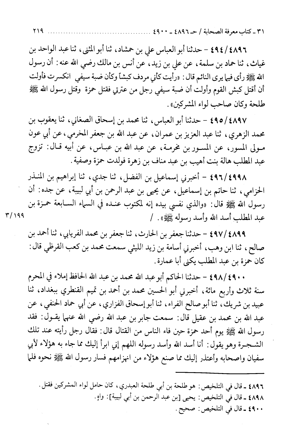 4896 - حَدَّثَنَا أَبُو الْعَبَّاسِ وَعَلِيُّ بْنُ حَمْشَاذَ، ثنا أَبُو الْمُثَنَّى، ثنا عَبْدُ الْوَاحِدِ بْنُ غِيَاثٍ، ثنا حَمَّادُ بْنُ سَلَمَةَ، عَنْ عَلِيِّ بْنِ زَيْدٍ، عَنْ أَنَسِ بْنِ مَالِكٍ رَضِيَ اللَّهُ عَنْهُ، أَنَّ رَسُولَ اللَّهِ صَلَّى اللهُ عَلَيْهِ وَسَلَّمَ رَأَى فِيمَا يَرَى النَّائِمُ، قَالَ: «§رَأَيْتُ كَأَنِّي مُرْدِفٌ كَبْشًا، وَكَأَنَّ ضَبَّةَ سَيْفِي انْكَسَرَتْ، فَأَوَّلْتُ أَنْ أَقْتُلَ كَبْشَ الْقَوْمِ، وَأَوَّلْتُ أَنَّ ضَبَّةَ سَيْفِي رَجُلٌ مِنْ عِتْرَتِي» فَقُتِلَ حَمْزَةُ، وَقَتَلَ رَسُولُ اللَّهِ صَلَّى اللهُ عَلَيْهِ وَسَلَّمَ طَلْحَةَ وَكَانَ صَاحِبَ لِوَاءِ الْمُشْرِكِينَ