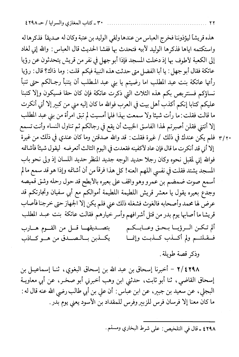 4298 - أَخْبَرَنَا إِسْحَاقُ بْنُ عَبْدِ اللَّهِ بْنِ إِسْحَاقَ الْبَغَوِيُّ، ثنا إِسْمَاعِيلُ بْنُ إِسْحَاقَ الْقَاضِي، ثنا أَبُو ثَابِتٍ، حَدَّثَنِي ابْنُ وَهْبٍ، أَخْبَرَنِي أَبُو صَخْرٍ، عَنْ أَبِي مُعَاوِيَةَ الْبَجَلِيِّ، عَنْ سَعِيدِ بْنِ جُبَيْرٍ، عَنِ ابْنِ عَبَّاسٍ، أَنَّ عَلِيَّ بْنَ أَبِي طَالِبٍ رَضِيَ اللَّهُ عَنْهُ، قَالَ لَهُ: «§مَا كَانَ مَعَنَا إِلَّا فَرَسَانِ فَرَسٌ لِلزُّبَيْرِ، وَفَرَسٌ لِلْمِقْدَادِ بْنِ الْأَسْوَدِ - يَعْنِي يَوْمَ بَدْرٍ -» هَذَا حَدِيثٌ صَحِيحٌ عَلَى شَرْطِ الشَّيْخَيْنِ «،» فَإِنَّ أَبَا ثَابِتٍ هُوَ مُحَمَّدُ بْنُ عُبَيْدِ اللَّهِ الْمَدِينِيُّ، وَأَبُو صَخْرٍ حُمَيْدُ بْنُ زِيَادٍ، وَأَبُو مُعَاوِيَةَ الْبَجَلِيُّ عَمَّارُ الدُّهْنِيُّ، وَكُلُّهُمْ مُتَّفَقٌ عَلَيْهِمْ وَلَمْ يُخَرِّجَاهُ "K4298 - على شرط البخاري ومسلم