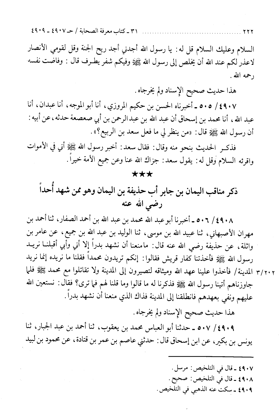 4909 - حَدَّثَنَا أَبُو الْعَبَّاسِ مُحَمَّدُ بْنُ يَعْقُوبَ، ثنا أَحْمَدُ بْنُ عَبْدِ الْجَبَّارِ، ثنا يُونُسُ بْنُ بُكَيْرٍ، عَنِ ابْنِ إِسْحَاقَ، قَالَ: حَدَّثَنِي عَاصِمُ بْنُ عُمَرَ بْنِ قَتَادَةَ، عَنْ مَحْمُودِ بْنِ لَبِيدٍ قَالَ: §" لَمَّا خَرَجَ رَسُولُ اللَّهِ صَلَّى اللهُ عَلَيْهِ وَسَلَّمَ إِلَى أُحُدٍ وَقَعَ الْيَمَانُ بْنُ جَابِرٍ أَبُ حُذَيْفَةَ وَثَابِتُ بْنُ وَقْشِ بْنِ زَعُورَاءَ فِي الْآطَامِ مَعَ النِّسَاءِ وَالصِّبْيَانِ، فَقَالَ أَحَدُهُمَا لِصَاحِبِهِ وَهُمَا شَيْخَانِ كَبِيرَانِ: لَا أَبَا لَكَ، مَا نَنْتَظِرُ فَوَاللَّهِ مَا بَقِيَ لِوَاحِدٍ مِنَّا مِنْ عُمُرِهِ إِلَّا ظَمَأُ حِمَارٍ، إِنَّمَا نَحْنُ هَامَةُ الْقَوْمِ، أَلَا نَأْخُذُ أَسْيَافَنَا ثُمَّ نَلْحَقُ بِرَسُولِ اللَّهِ صَلَّى اللهُ عَلَيْهِ وَسَلَّمَ، فَدَخَلَا فِي الْمُسْلِمِينَ وَلَا يَعْلَمُونَ بِهِمَا، فَأَمَّا ثَابِتُ بْنُ وَقْشٍ فَقَتَلَهُ الْمُشْرِكُونَ، وَأَمَّا أَبُ حُذَيْفَةَ فَاخْتَلَفَتْ عَلَيْهِ أَسْيَافُ الْمُسْلِمِينَ، فَقَتَلُوهُ وَلَا يَعْرِفُونَهُ، فَقَالَ حُذَيْفَةُ: أَبِي أَبِي، فَقَالُوا: وَاللَّهِ مَا عَرَفْنَاهُ، وَصُدِّقُوا، فَقَالَ حُذَيْفَةُ: يَغْفِرُ اللَّهُ لَكُمْ وَهُوَ أَرْحَمُ الرَّاحِمِينَ، فَأَرَادَ رَسُولُ اللَّهِ صَلَّى اللهُ عَلَيْهِ وَسَلَّمَ أَنْ يَدَيَهُ، فَتَصَدَّقَ بِهِ حُذَيْفَةُ عَلَى الْمُسْلِمِينَ، فَزَادَهُ ذَلِكَ عِنْدَ رَسُولِ اللَّهِ صَلَّى اللهُ عَلَيْهِ وَسَلَّمَ «هَذَا حَدِيثٌ صَحِيحٌ عَلَى شَرْطِ مُسْلِمٍ، وَلَمْ يُخَرِّجَاهُ» K4909 - سكت عنه الذهبي في التلخيص