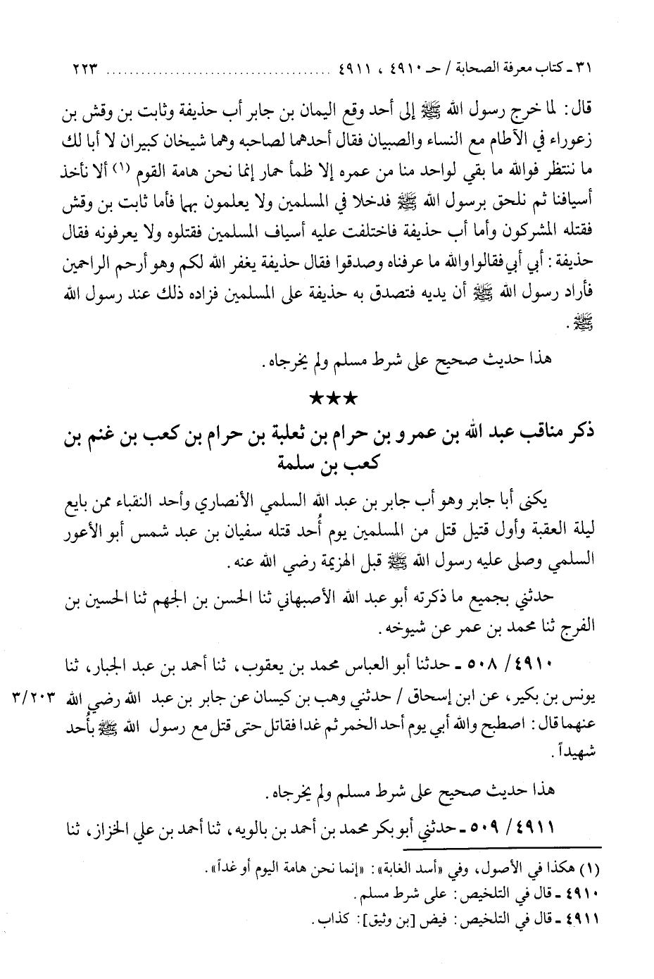 §ذِكْرُ مَنَاقِبِ عَبْدِ اللَّهِ بْنِ عَمْرِو بْنِ حَرَامِ بْنِ ثَعْلَبَةَ بْنِ حَرَامِ بْنِ كَعْبِ بْنِ غَنْمِ بْنِ كَعْبِ بْنِ سَلَمَةَ «يُكَنَّى أَبَا جَابِرٍ، وَهُوَ أَبُ جَابِرِ بْنِ عَبْدِ اللَّهِ السُّلَمِيِّ الْأَنْصَارِيِّ وَأَحَدُ النُّقَبَاءِ مِمَّنْ بَايَعَ لَيْلَةَ الْعَقَبَةِ، وَأَوَّلُ قَتِيلٍ قُتِلَ مِنَ الْمُسْلِمِينَ يَوْمَ أُحُدٍ، قَتَلَهُ سُفْيَانُ بْنُ عَبْدِ شَمْسٍ أَبُو الْأَعْوَرِ السُّلَمِيُّ، وَصَلَّى عَلَيْهِ رَسُولُ اللَّهِ صَلَّى اللهُ عَلَيْهِ وَسَلَّمَ قَبْلَ الْهَزِيمَةِ رَضِيَ اللَّهُ عَنْهُ، حَدَّثَنِي بِجَمِيعِ مَا ذَكَرْتُهُ أَبُو عَبْدِ اللَّهِ الْأَصْبَهَانِيُّ، ثنا الْحَسَنُ بْنُ الْجَهْمِ، ثنا الْحُسَيْنُ بْنُ الْفَرَجِ، ثنا مُحَمَّدُ بْنُ عُمَرَ عَنْ شُيُوخِهِ»