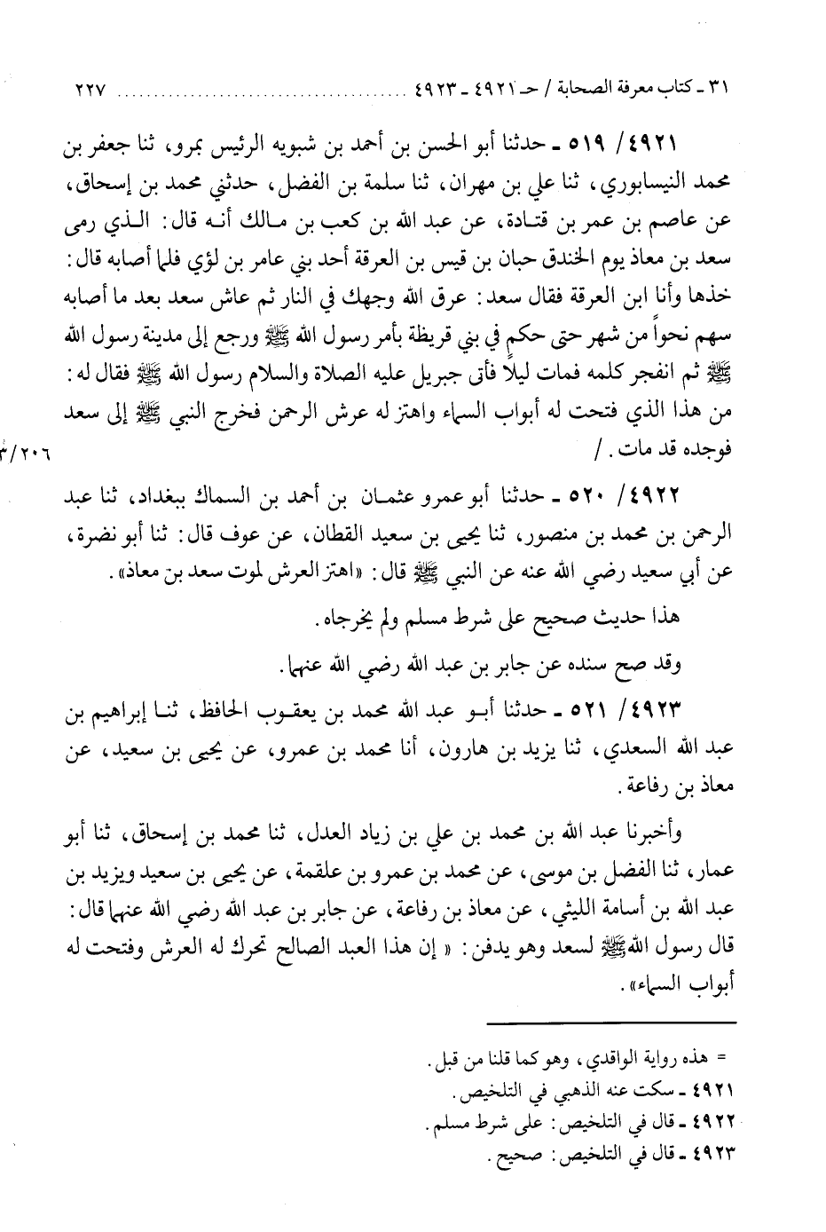 4921 - حَدَّثَنَا أَبُو الْحَسَنِ بْنُ أَحْمَدَ بْنِ شَبُّوَيْهِ الرَّئِيسُ بِمَرْوَ، ثنا جَعْفَرُ بْنُ مُحَمَّدٍ النَّيْسَابُورِيُّ، ثنا عَلِيُّ بْنُ مِهْرَانَ، ثنا سَلَمَةُ بْنُ الْفَضْلِ، حَدَّثَنِي مُحَمَّدُ بْنُ إِسْحَاقَ، عَنْ عَاصِمِ بْنِ عُمَرَ بْنِ قَتَادَةَ، عَنْ عَبْدِ اللَّهِ بْنِ كَعْبِ بْنِ مَالِكٍ أَنَّهُ قَالَ: الَّذِي رَمَى سَعْدَ بْنَ مُعَاذٍ يَوْمَ الْخَنْدَقِ حَبَّانُ بْنُ قَيْسِ بْنِ الْعَرِقَةِ أَحَدُ بَنِي عَامِرِ بْنِ لُؤَيٍّ، فَلَمَّا أَصَابَهُ قَالَ: خُذْهَا وَأَنَا ابْنُ الْعَرِقَةِ، فَقَالَ سَعْدٌ: عَرَّقَ اللَّهُ وَجْهَكَ فِي النَّارِ، ثُمَّ عَاشَ سَعْدٌ بَعْدَ مَا أَصَابَهُ سَهْمٌ نَحْوًا مِنْ شَهْرٍ، حَتَّى حَكَمَ فِي بَنِي قُرَيْظَةَ بِأَمْرِ رَسُولِ اللَّهِ صَلَّى اللهُ عَلَيْهِ وَسَلَّمَ وَرَجَعَ إِلَى مَدِينَةِ رَسُولِ اللَّهِ صَلَّى اللهُ عَلَيْهِ وَسَلَّمَ، ثُمَّ انْفَجَرَ كَلِمُهُ فَمَاتَ لَيْلًا، فَأَتَى جِبْرِيلُ عَلَيْهِ الصَّلَاةُ وَالسَّلَامُ رَسُولَ اللَّهِ صَلَّى اللهُ عَلَيْهِ وَسَلَّمَ، فَقَالَ لَهُ: §مَنْ هَذَا الَّذِي فُتِحَتْ لَهُ أَبْوَابُ السَّمَاءِ وَاهْتَزَّ لَهُ عَرْشُ الرَّحْمَنِ؟ «فَخَرَجَ النَّبِيُّ صَلَّى اللهُ عَلَيْهِ وَسَلَّمَ إِلَى سَعْدٍ فَوَجَدَهُ قَدْ مَاتَ» K4921 - سكت عنه الذهبي في التلخيص