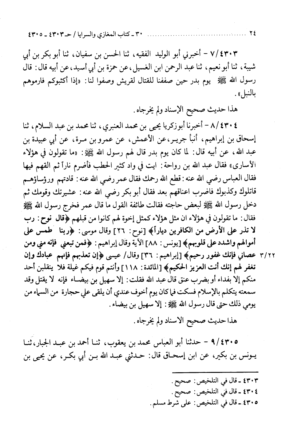 4303 - أَخْبَرَنِي أَبُو الْوَلِيدِ الْفَقِيهُ، ثنا الْحَسَنُ بْنُ سُفْيَانَ، ثنا أَبُو بَكْرِ بْنُ أَبِي شَيْبَةَ، ثنا أَبُو نُعَيْمٍ، ثنا عَبْدُ الرَّحْمَنِ بْنُ الْغَسِيلِ، عَنْ حَمْزَةَ بْنِ أَبِي أُسَيْدٍ، عَنْ أَبِيهِ قَالَ: قَالَ رَسُولُ اللَّهِ صَلَّى اللهُ عَلَيْهِ وَسَلَّمَ يَوْمَ بَدْرٍ حِينَ صُفِفْنَا لِلْقِتَالِ لِقُرَيْشٍ وَصُفُّوا لَنَا: §«إِذَا أَكْثَبُوكُمْ فَارْمُوهُمْ بِالنَّبْلِ» هَذَا حَدِيثٌ صَحِيحُ الْإِسْنَادِ وَلَمْ يُخَرِّجَاهُ "K4303 - صحيح