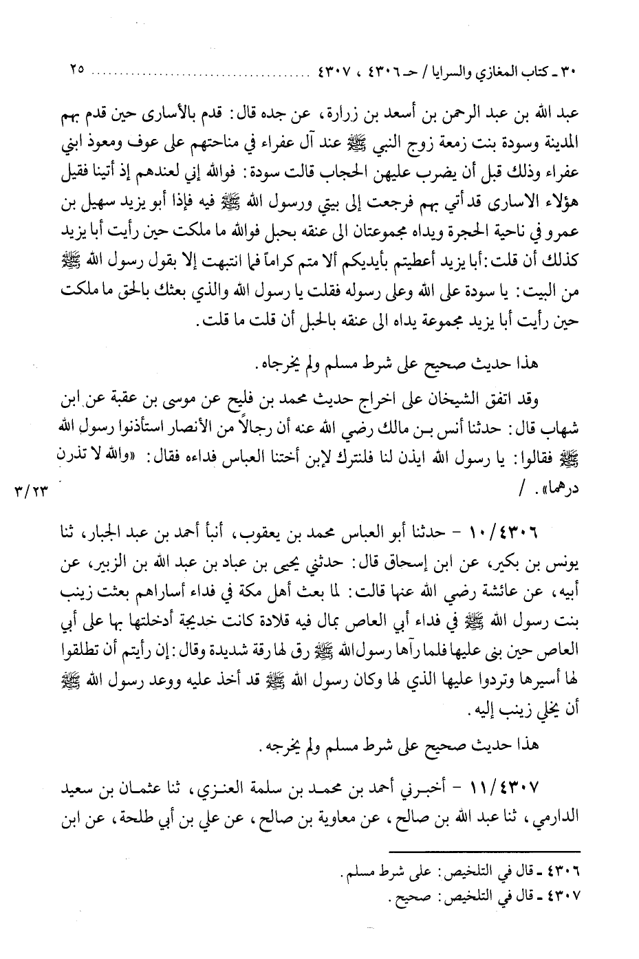4306 - حَدَّثَنَا أَبُو الْعَبَّاسِ مُحَمَّدُ بْنُ يَعْقُوبَ، أَنْبَأَ أَحْمَدُ بْنُ عَبْدِ الْجَبَّارِ، ثنا يُونُسُ بْنُ بُكَيْرٍ، عَنِ ابْنِ إِسْحَاقَ، قَالَ: حَدَّثَنِي يَحْيَى بْنُ عَبَّادِ بْنِ عَبْدِ اللَّهِ بْنِ الزُّبَيْرِ، عَنْ أَبِيهِ، عَنْ عَائِشَةَ رَضِيَ اللَّهُ عَنْهَا قَالَتْ: لَمَّا بَعَثَ أَهْلُ مَكَّةَ فِي فِدَاءِ أَسَارَاهُمْ، بَعَثَتْ زَيْنَبُ بِنْتُ رَسُولِ اللَّهِ صَلَّى اللهُ عَلَيْهِ وَسَلَّمَ فِي فِدَاءِ أَبِي الْعَاصِ بِمَالٍ فِيهِ قِلَادَةٌ كَانَتْ خَدِيجَةُ أَدْخَلَتْهَا بِهَا عَلَى أَبِي الْعَاصِ حِينَ بَنَى عَلَيْهَا، فَلَمَّا رَآهَا رَسُولُ اللَّهِ صَلَّى اللهُ عَلَيْهِ وَسَلَّمَ رَقَّ لَهَا رِقَّةً شَدِيدَةً وَقَالَ: §«إِنْ رَأَيْتُمْ أَنْ تُطْلِقُوا لَهَا أَسِيرَهَا وَتَرُدُّوا عَلَيْهَا الَّذِي لَهَا» وَكَانَ رَسُولُ اللَّهِ صَلَّى اللهُ عَلَيْهِ وَسَلَّمَ قَدْ أَخَذَ عَلَيْهِ، وَوَعَدَ رَسُولَ اللَّهِ صَلَّى اللهُ عَلَيْهِ وَسَلَّمَ أَنْ يُخَلِّيَ زَيْنَبَ إِلَيْهِ «هَذَا حَدِيثٌ صَحِيحٌ عَلَى شَرْطِ مُسْلِمٍ، وَلَمْ يُخَرِّجْهُ» K4306 - على شرط مسلم