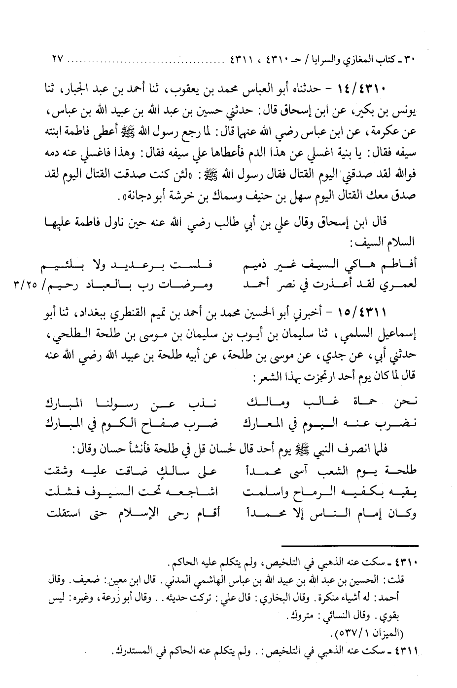 4310 - حَدَّثَنَاهُ أَبُو الْعَبَّاسِ مُحَمَّدُ بْنُ يَعْقُوبَ، ثنا أَحْمَدُ بْنُ عَبْدِ الْجَبَّارِ، ثنا يُونُسُ بْنُ بُكَيْرٍ، عَنِ ابْنِ إِسْحَاقَ، قَالَ: حَدَّثَنِي حُسَيْنُ بْنُ عَبْدِ اللَّهِ بْنِ عُبَيْدِ اللَّهِ بْنِ عَبَّاسٍ، عَنْ عِكْرِمَةَ، عَنِ ابْنِ عَبَّاسٍ رَضِيَ اللَّهُ عَنْهُمَا قَالَ: لَمَّا رَجَعَ رَسُولُ اللَّهِ صَلَّى اللهُ عَلَيْهِ وَسَلَّمَ أَعْطَى فَاطِمَةَ ابْنَتَهُ سَيْفَهُ، فَقَالَ: «يَا بُنَيَّةُ اغْسِلِي عَنْ هَذَا الدَّمِ» فَأَعْطَاهَا عَلِيٌّ سَيْفَهُ، فَقَالَ: وَهَذَا فَاغْسِلِي عَنْهُ دَمَهُ، فَوَاللَّهِ لَقَدْ صَدَقَنِي الْيَوْمَ الْقِتَالَ، فَقَالَ رَسُولُ اللَّهِ صَلَّى اللهُ عَلَيْهِ وَسَلَّمَ: §«لَئِنْ كُنْتَ صَدَقْتَ الْقِتَالَ الْيَوْمَ لَقَدْ صَدَقَ مَعَكَ الْقِتَالُ الْيَوْمَ سَهْلُ بْنُ حُنَيْفٍ وَسِمَاكُ بْنُ خَرَشَةَ أَبُو دُجَانَةَ» قَالَ ابْنُ إِسْحَاقَ: وَقَالَ عَلِيُّ بْنُ أَبِي طَالِبٍ رَضِيَ اللَّهُ عَنْهُ حِينَ نَاوَلَ فَاطِمَةَ عَلَيْهَا السَّلَامُ السَّيْفَ «