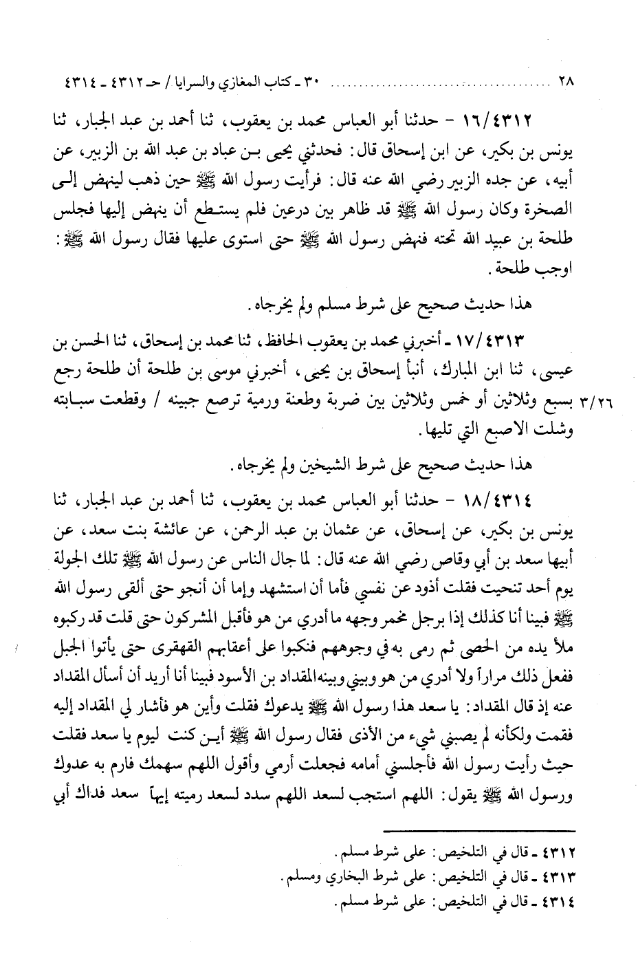 4312 - حَدَّثَنَا أَبُو الْعَبَّاسِ مُحَمَّدُ بْنُ يَعْقُوبَ، ثنا أَحْمَدُ بْنُ عَبْدِ الْجَبَّارِ، ثنا يُونُسُ بْنُ بُكَيْرٍ، عَنِ ابْنِ إِسْحَاقَ، قَالَ: فَحَدَّثَنِي يَحْيَى بْنُ عَبَّادِ بْنِ عَبْدِ اللَّهِ بْنِ الزُّبَيْرِ، عَنْ أَبِيهِ، عَنْ جَدِّهِ الزُّبَيْرِ رَضِيَ اللَّهُ عَنْهُ قَالَ: §" فَرَأَيْتُ رَسُولَ اللَّهِ صَلَّى اللهُ عَلَيْهِ وَسَلَّمَ حِينَ ذَهَبَ لِيَنْهَضَ إِلَى الصَّخْرَةِ، وَكَانَ رَسُولُ اللَّهِ صَلَّى اللهُ عَلَيْهِ وَسَلَّمَ قَدْ ظَاهَرَ بَيْنَ دِرْعَيْنِ، فَلَمْ يَسْتَطِعْ أَنْ يَنْهَضَ إِلَيْهَا، فَجَلَسَ طَلْحَةُ بْنُ عُبَيْدِ اللَّهِ تَحْتَهُ، فَنَهَضَ رَسُولُ اللَّهِ صَلَّى اللهُ عَلَيْهِ وَسَلَّمَ حَتَّى اسْتَوَى عَلَيْهَا، فَقَالَ رَسُولُ اللَّهِ صَلَّى اللهُ عَلَيْهِ وَسَلَّمَ: «أَوْجَبَ طَلْحَةُ» هَذَا حَدِيثٌ صَحِيحٌ عَلَى شَرْطِ مُسْلِمٍ، وَلَمْ يُخَرِّجَاهُ "K4312 - على شرط مسلم