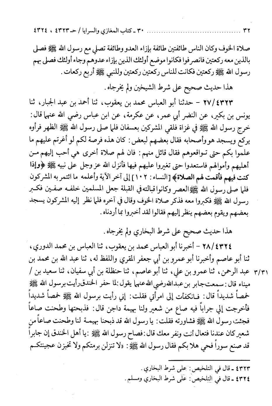 4323 - حَدَّثَنَا أَبُو الْعَبَّاسِ مُحَمَّدُ بْنُ يَعْقُوبَ، ثنا أَحْمَدُ بْنُ عَبْدِ الْجَبَّارِ، ثنا يُونُسُ بْنُ بُكَيْرٍ، عَنِ النَّضْرِ أَبِي عُمَرَ، عَنْ عِكْرِمَةَ، عَنِ ابْنِ عَبَّاسٍ رَضِيَ اللَّهُ عَنْهُمَا قَالَ: «خَرَجَ رَسُولُ اللَّهِ صَلَّى اللهُ عَلَيْهِ وَسَلَّمَ فِي غَزَاةٍ فَلَقِيَ الْمُشْرِكِينَ بِعُسْفَانَ، فَلَمَّا صَلَّى رَسُولُ اللَّهِ صَلَّى اللهُ عَلَيْهِ وَسَلَّمَ الظُّهْرَ فَرَأَوْهُ يَرْكَعُ وَيَسْجُدُ هُوَ وَأَصْحَابُهُ» ، فَقَالَ بَعْضُهُمْ لِبَعْضٍ: كَانَ هَذِهِ فِرْصَةً لَكُمْ لَوْ أَغَرْتُمْ عَلَيْهِمْ، مَا عَلِمُوا بِكُمْ حَتَّى تُوَاقِعُوهُمْ، فَقَالَ قَائِلٌ مِنْهُمْ: فَإِنَّ لَهُمْ صَلَاةً أُخْرَى هِيَ أَحَبُّ إِلَيْهِمْ مِنْ أَهْلِيهِمْ وَأَمْوَالِهِمْ فَاسْتَعِدِّوا حَتَّى تُغِيرُوا عَلَيْهِمْ فِيهَا، فَأَنْزَلَ اللَّهُ عَزَّ وَجَلَّ عَلَى نَبِيِّهِ صَلَّى اللهُ عَلَيْهِ وَسَلَّمَ: {§وَإِذَا كُنْتَ فِيهِمْ فَأَقَمْتَ لَهُمُ الصَّلَاةَ} [النساء: 102] إِلَى آخِرِ الْآيَةَ، وَأَعْلَمَهُ مَا ائْتَمَرَ بِهِ الْمُشْرِكُونَ، «فَلَمَّا صَلَّى رَسُولُ اللَّهِ صَلَّى اللهُ عَلَيْهِ وَسَلَّمَ الْعَصْرَ، وَكَانُوا قِبَالَتَهُ فِي الْقِبْلَةِ جَعَلَ الْمُسْلِمِينَ خَلْفَهُ صَفَّيْنِ، فَكَبَّرَ رَسُولُ اللَّهِ صَلَّى اللهُ عَلَيْهِ وَسَلَّمَ فَكَبِّرُوا مَعَهُ» ، - فَذَكَرَ صَلَاةَ الْخَوْفِ - وَقَالَ فِي آخِرِهِ، فَلَمَّا نَظَرَ إِلَيْهِ الْمُشْرِكُونَ يَسْجُدُ بَعْضُهُمْ وَيَقُومُ بَعْضُهُمْ يَنْظُرُ إِلَيْهِمْ فَقَالُوا: لَقَدْ أُخْبِرُوا بِمَا أَرَدْنَاهُ «هَذَا حَدِيثٌ صَحِيحٌ عَلَى شَرْطِ الْبُخَارِيِّ، وَلَمْ يُخَرِّجَاهُ» K4323 - على شرط البخاري