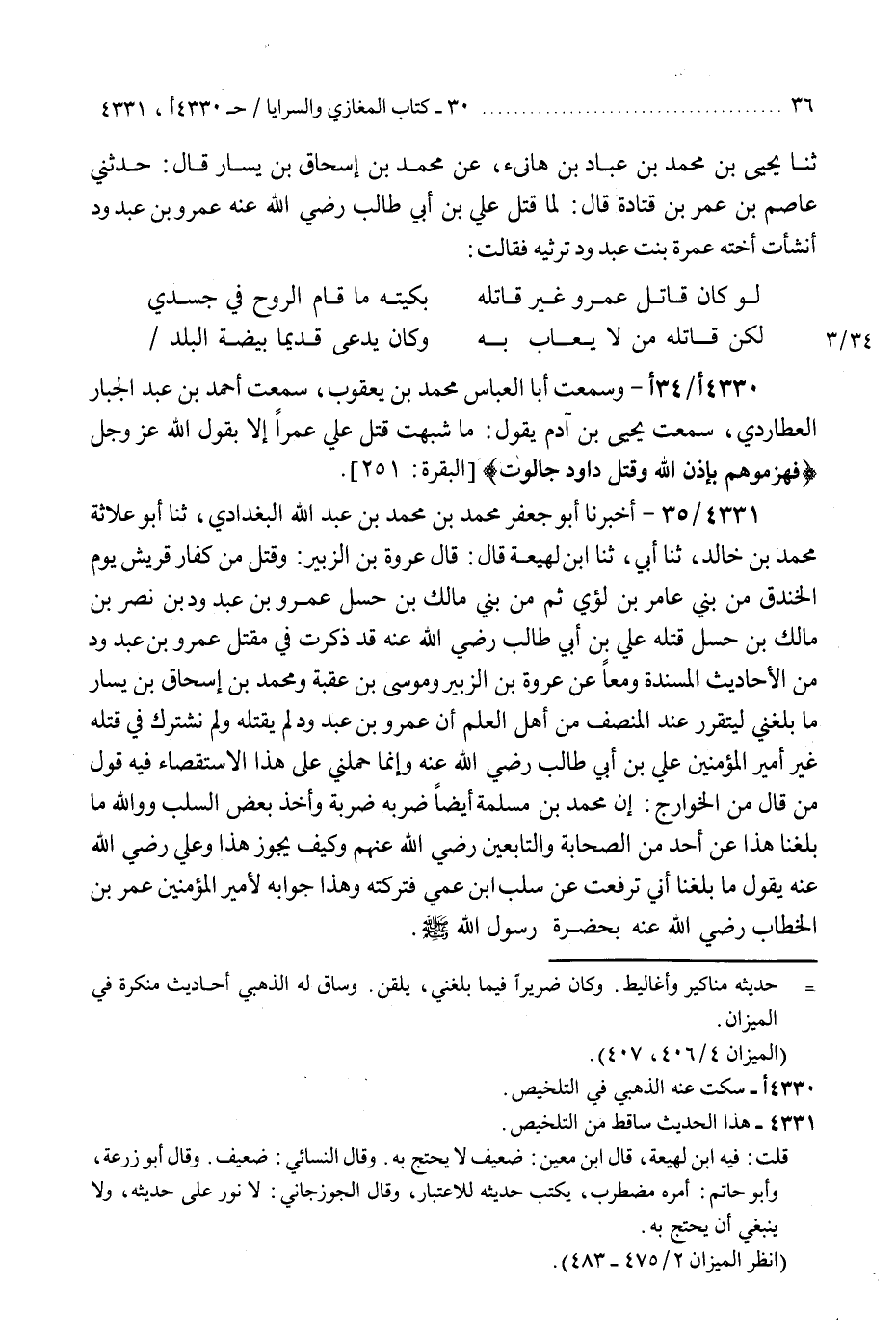 4331 - أَخْبَرَنَا أَبُو جَعْفَرٍ مُحَمَّدُ بْنُ مُحَمَّدِ بْنِ عَبْدِ اللَّهِ الْبَغْدَادِيُّ، ثنا أَبُو عُلَاثَةَ مُحَمَّدُ بْنُ خَالِدٍ، ثنا أَبِي، ثنا ابْنُ لَهِيعَةَ، قَالَ: قَالَ عُرْوَةُ بْنُ الزُّبَيْرِ: §«وَقُتِلَ مِنْ كُفَّارِ قُرَيْشٍ يَوْمَ الْخَنْدَقِ مِنْ بَنِي عَامِرِ بْنِ لُؤَيٍّ، ثُمَّ مِنْ بَنِي مَالِكِ بْنِ حَسَلٍ عَمْرُو بْنُ عَبْدِ وَدِّ بْنِ نَصْرِ بْنِ مَالِكِ بْنِ حَسَلٍ قَتَلَهُ عَلِيُّ بْنُ أَبِي طَالِبٍ رَضِيَ اللَّهُ عَنْهُ» ، " قَدْ ذَكَرْتُ فِي مَقْتَلِ عَمْرِو بْنِ عَبْدِ وُدٍّ مِنَ الْأَحَادِيثِ الْمُسْنَدَةِ وَمَعًا، عَنْ عُرْوَةَ بْنِ الزُّبَيْرِ، وَمُوسَى بْنِ عُقْبَةَ، وَمُحَمَّدِ بْنِ إِسْحَاقَ بْنِ يَسَارٍ مَا بَلَغَنِي لِيَتَقَرَّرَ عِنْدَ الْمُنْصِفِ مِنْ أَهْلِ الْعِلْمِ، أَنَّ عَمْرَو بْنَ عَبْدِ وَدٍّ لَمْ يَقْتُلْهُ، وَلَمْ نَشْتَرِكْ فِي قَتْلِهِ غَيْرُ أَمِيرِ الْمُؤْمِنِينَ عَلِيُّ بْنُ أَبِي طَالِبٍ رَضِيَ اللَّهُ عَنْهُ، وَإِنَّمَا حَمَلَنِي عَلَى هَذَا الِاسْتِقْصَاءِ فِيهِ قَوْلُ مَنْ قَالَ مِنَ الْخَوَارِجِ: إِنَّ مُحَمَّدَ بْنَ مَسْلَمَةَ أَيْضًا ضَرَبَهُ ضَرْبَةً، وَأَخَذَ بَعْضَ السَّلْبِ، وَوَاللَّهِ مَا بَلَغَنَا هَذَا عَنْ أَحَدٍ مِنَ الصَّحَابَةِ وَالتَّابِعِينَ رَضِيَ اللَّهُ عَنْهُمْ، وَكَيْفَ يَجُوزُ هَذَا وَعَلِيٌّ رَضِيَ اللَّهُ عَنْهُ يَقُولُ: «مَا بَلَغَنَا أَنِّي تَرَفَّعْتُ عَنْ سَلْبِ ابْنِ عَمِّي فَتَرَكْتُهُ» وَهَذَا جَوَابُهُ لِأَمِيرِ الْمُؤْمِنِينَ عُمَرَ بْنِ الْخَطَّابِ رَضِيَ اللَّهُ عَنْهُ بِحَضْرَةِ رَسُولِ اللَّهِ صَلَّى اللهُ عَلَيْهِ وَسَلَّمَ "