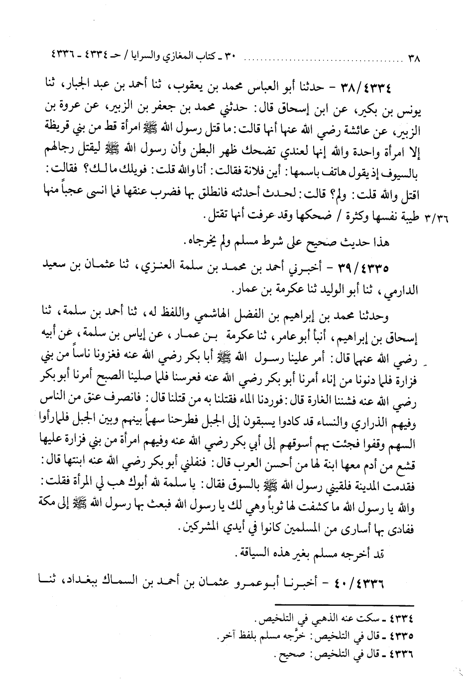 4335 - أَخْبَرَنِي أَحْمَدُ بْنُ مُحَمَّدِ بْنِ سَلَمَةَ الْعَنَزِيُّ، ثنا عُثْمَانُ بْنُ سَعِيدٍ الدَّارِمِيُّ، ثنا أَبُو الْوَلِيدِ، ثنا عِكْرِمَةُ بْنُ عَمَّارٍ، وَحَدَّثَنَا مُحَمَّدُ بْنُ إِبْرَاهِيمَ بْنِ الْفَضْلِ الْهَاشِمِيُّ، وَاللَّفْظُ لَهُ، ثنا أَحْمَدُ بْنُ سَلَمَةَ، ثنا إِسْحَاقُ بْنُ إِبْرَاهِيمَ، أَنْبَأَ أَبُو عَامِرٍ، ثنا عِكْرِمَةُ بْنُ عَمَّارٍ، عَنْ إِيَاسِ بْنِ سَلَمَةَ، عَنْ أَبِيهِ رَضِيَ اللَّهُ عَنْهُمَا قَالَ: §أَمَّرَ عَلَيْنَا رَسُولُ اللَّهِ صَلَّى اللهُ عَلَيْهِ وَسَلَّمَ أَبَا بَكْرٍ رَضِيَ اللَّهُ عَنْهُ، فَغَزَوْنَا نَاسًا مِنْ بَنِي فَزَارَةَ، فَلَمَّا دَنَوْنَا مِنْ إِنَاءٍ، أَمَرَنَا أَبُو بَكْرٍ رَضِيَ اللَّهُ عَنْهُ فَعَرَّسْنَا، فَلَمَّا صَلَّيْنَا الصُّبْحَ أَمَرَنَا أَبُو بَكْرٍ رَضِيَ اللَّهُ عَنْهُ فَشَنَنَّا الْغَارَةَ، قَالَ: فَوَرَدْنَا الْمَاءَ فَقَتَلْنَا بِهِ مَنْ قَتَلْنَا، قَالَ: فَانْصَرَفَ عُنُقٌ مِنَ النَّاسِ وَفِيهِمُ الذَّرَارِيُّ وَالنِّسَاءُ قَدْ كَادُوا يَسْبِقُونَ إِلَى الْجَبَلِ، فَطَرَحْنَا سَهْمًا بَيْنَهُمْ وَبَيْنَ الْجَبَلِ، فَلَمَّا رَأَوُا السَّهْمَ وَقَفُوا، فَجِئْتُ بِهِمْ أَسُوقُهُمْ إِلَى أَبِي بَكْرٍ رَضِيَ اللَّهُ عَنْهُ، وَفِيهِمُ امْرَأَةٌ مِنْ بَنِي فَزَارَةَ عَلَيْهَا قَشْعٌ مِنْ أَدَمٍ، مَعَهَا ابْنَةٌ لَهَا مِنْ أَحْسَنِ الْعَرَبِ، قَالَ: فَنَفَّلَنِي أَبُو بَكْرٍ رَضِيَ اللَّهُ عَنْهُ ابْنَتَهَا، قَالَ: فَقَدِمْتُ الْمَدِينَةَ، فَلَقِيَنِي رَسُولُ اللَّهِ صَلَّى اللهُ عَلَيْهِ وَسَلَّمَ بِالسُّوقِ، فَقَالَ: «يَا سَلَمَةُ، لِلَّهِ أَبُوكَ هَبْ لِي الْمَرْأَةَ» فَقُلْتُ: وَاللَّهِ يَا رَسُولَ اللَّهِ، مَا كَشَفْتُ لَهَا ثَوْبًا، وَهِيَ لَكَ يَا رَسُولَ اللَّهِ، فَبَعَثَ بِهَا رَسُولُ اللَّهِ صَلَّى اللهُ عَلَيْهِ وَسَلَّمَ إِلَى مَكَّةَ، فَفَادَى بِهَا أُسَارَى مِنَ الْمُسْلِمِينَ كَانُوا فِي أَيْدِي الْمُشْرِكِينَ «قَدْ أَخْرَجَهُ مُسْلِمٌ بِغَيْرِ هَذِهِ السِّيَاقَةِ» K4335 - خرجه مسلم بفظ آخر