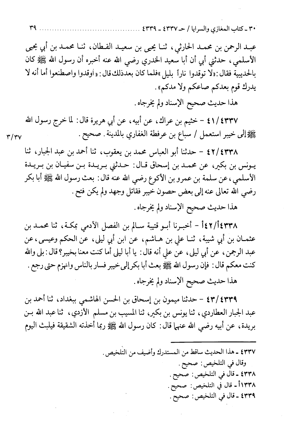 4338 - أَخْبَرَنَا أَبُو قُتَيْبَةَ سَالِمُ بْنُ الْفَصْلِ الْآدَمِيُّ، بِمَكَّةَ، ثنا مُحَمَّدُ بْنُ عُثْمَانَ بْنِ أَبِي شَيْبَةَ، ثنا عَلِيُّ بْنُ هَاشِمٍ، عَنِ ابْنِ أَبِي لَيْلَى، عَنِ الْحَكَمِ، وَعِيسَى، عَنْ عَبْدِ الرَّحْمَنِ، عَنْ أَبِي لَيْلَى، عَنْ عَلِيٍّ أَنَّهُ قَالَ: يَا أَبَا لَيْلَى أَمَا كُنْتَ مَعَنَا بِخَيْبَرَ؟ قَالَ: بَلَى وَاللَّهِ كُنْتُ مَعَكُمْ، قَالَ: فَإِنَّ رَسُولَ اللَّهِ صَلَّى اللهُ عَلَيْهِ وَسَلَّمَ §«بَعَثَ أَبَا بَكْرٍ إِلَى خَيْبَرَ فَسَارَ بِالنَّاسِ وَانْهَزَمَ حَتَّى رَجَعَ» هَذَا حَدِيثٌ صَحِيحُ الْإِسْنَادِ، وَلَمْ يُخَرِّجَاهُ "K4338 - صحيح