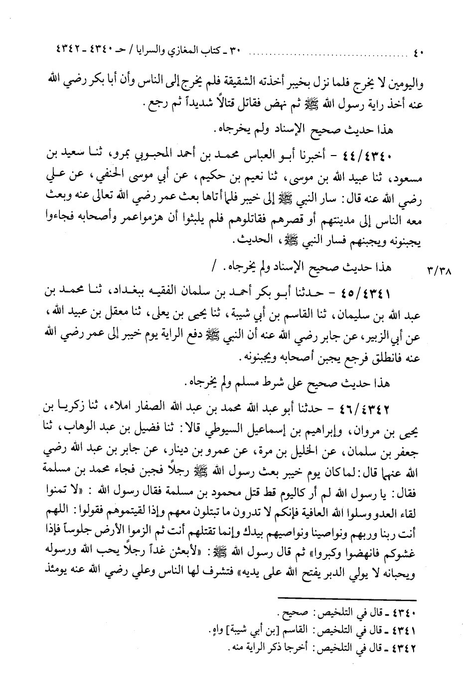 4340 - أَخْبَرَنَا أَبُو الْعَبَّاسِ مُحَمَّدُ بْنُ أَحْمَدَ الْمَحْبُوبِيُّ، بِمَرْوَ، ثنا سَعِيدُ بْنُ مَسْعُودٍ، ثنا عُبَيْدُ اللَّهِ بْنُ مُوسَى، ثنا نُعَيْمُ بْنُ حَكِيمٍ، عَنْ أَبِي مُوسَى الْحَنَفِيِّ، عَنْ عَلِيٍّ رَضِيَ اللَّهُ عَنْهُ قَالَ: «§سَارَ النَّبِيُّ صَلَّى اللهُ عَلَيْهِ وَسَلَّمَ إِلَى خَيْبَرَ، فَلَمَّا أَتَاهَا بَعَثَ عُمَرُ رَضِيَ اللَّهُ تَعَالَى عَنْهُ، وَبَعَثَ مَعَهُ النَّاسَ إِلَى مَدِينَتِهِمْ أَوْ قَصْرِهِمْ، فَقَاتَلُوهُمْ فَلَمْ يَلْبَثُوا أَنْ هَزَمُوا عُمَرَ وَأَصْحَابَهُ، فَجَاءُوا يُجَبِّنُونَهُ وَيُجَبِّنُهُمْ فَسَارَ النَّبِيُّ صَلَّى اللهُ عَلَيْهِ وَسَلَّمَ» الْحَدِيثُ. «هَذَا حَدِيثٌ صَحِيحُ الْإِسْنَادِ، وَلَمْ يُخَرِّجَاهُ» K4340 - صحيح