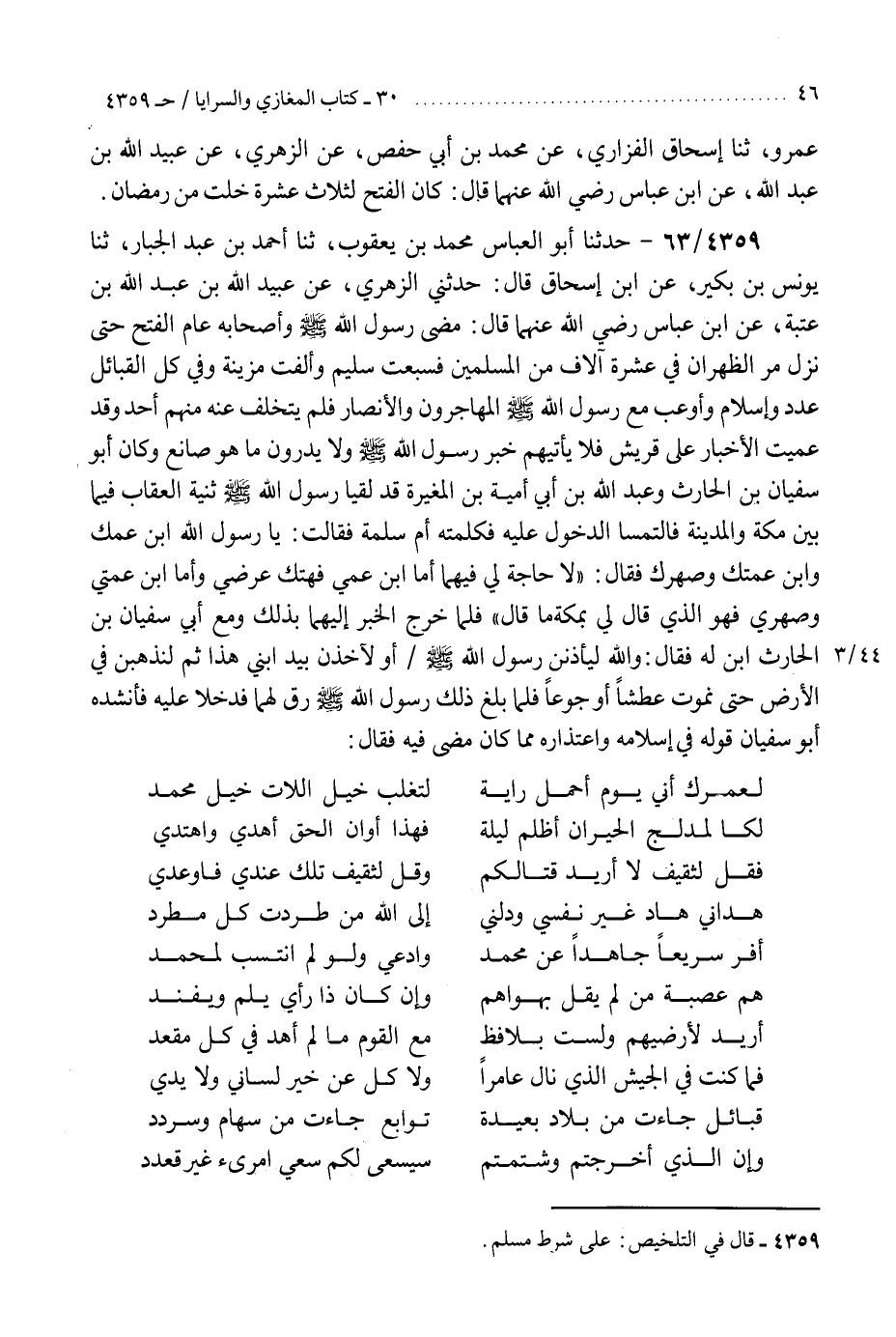 4359 - حَدَّثَنَا أَبُو الْعَبَّاسِ مُحَمَّدُ بْنُ يَعْقُوبَ، ثنا أَحْمَدُ بْنُ عَبْدِ الْجَبَّارِ، ثنا يُونُسُ بْنُ بُكَيْرٍ، عَنِ ابْنِ إِسْحَاقَ، قَالَ: حَدَّثَنِي الزُّهْرِيُّ، عَنْ عُبَيْدِ اللَّهِ بْنِ عَبْدِ اللَّهِ بْنِ عُتْبَةَ، عَنِ ابْنِ عَبَّاسٍ رَضِيَ اللَّهُ عَنْهُمَا قَالَ: مَضَى رَسُولُ اللَّهِ صَلَّى اللهُ عَلَيْهِ وَسَلَّمَ وَأَصْحَابُهُ عَامَ الْفَتْحِ حَتَّى نَزَلَ مَرَّ الظَّهْرَانِ فِي عَشَرَةِ آلَافٍ مِنَ الْمُسْلِمِينَ، فَسَبَّعَتْ سُلَيْمٌ وَأَلَّفَتْ مُزَيْنَةُ وَفِي كُلِّ الْقَبَائِلِ عَدَدٌ وَإِسْلَامٌ وَأَوْعَبَ مَعَ رَسُولِ اللَّهِ صَلَّى اللهُ عَلَيْهِ وَسَلَّمَ الْمُهَاجِرُونَ وَالْأَنْصَارُ، فَلَمْ يَتَخَلَّفْ عَنْهُ مِنْهُمْ أَحَدٌ، وَقَدْ عَمِيَتِ الْأَخْبَارُ عَلَى قُرَيْشٍ، فَلَا يَأْتِيَهُمْ خَبَرُ رَسُولِ اللَّهِ صَلَّى اللهُ عَلَيْهِ وَسَلَّمَ وَلَا يَدْرُونَ مَا هُوَ صَانِعٌ، وَكَانَ أَبُو سُفْيَانُ بْنُ الْحَارِثِ وَعَبْدُ اللَّهِ بْنُ أَبِي أُمَيَّةَ بْنِ الْمُغِيرَةِ قَدْ لَقِيَا رَسُولَ اللَّهِ صَلَّى اللهُ عَلَيْهِ وَسَلَّمَ ثَنِيَّةَ الْعِقَابِ فِيمَا بَيْنَ مَكَّةَ وَالْمَدِينَةِ، فَالْتَمَسَا الدُّخُولَ عَلَيْهِ، فَكَلَّمَتْهُ أُمُّ سَلَمَةَ فَقَالَتْ: يَا رَسُولَ اللَّهِ، ابْنُ عَمِّكَ، وَابْنُ عَمَّتِكَ، وَصِهْرُكِ، فَقَالَ: «§لَا حَاجَةَ لِي فِيهِمَا، أَمَّا ابْنُ عَمِّي فَهَتَكَ عِرْضِي، وَأَمَّا ابْنُ عَمَّتِي وَصِهْرِي فَهُوَ الَّذِي، قَالَ لِي بِمَكَّةَ مَا قَالَ» فَلَمَّا خَرَجَ الْخَبَرُ إِلَيْهِمَا بِذَلِكَ وَمَعَ أَبِي سُفْيَانَ بْنِ الْحَارِثِ ابْنٌ لَهُ فَقَالَ: وَاللَّهِ لَيَأَذْنَنَّ رَسُولُ صَلَّى اللهُ عَلَيْهِ وَسَلَّمَ أَوْ لَآخُذَنَّ بِيَدِ ابْنِي هَذَا، ثُمَّ لَنَذْهَبَنَّ فِي الْأَرْضِ حَتَّى نَمُوتَ عَطَشًا أَوْ جُوعًا، فَلَمَّا بَلَغَ ذَلِكَ رَسُولَ اللَّهِ صَلَّى اللهُ عَلَيْهِ وَسَلَّمَ رَقَّ لَهُمَا فَدَخَلَا عَلَيْهِ فَأَنْشَدَهُ أَبُو سُفْيَانَ قَوْلَهُ فِي إِسْلَامِهِ، وَاعْتِذَارِهِ مِمَّا كَانَ مَضَى فِيهِ، فَقَالَ: