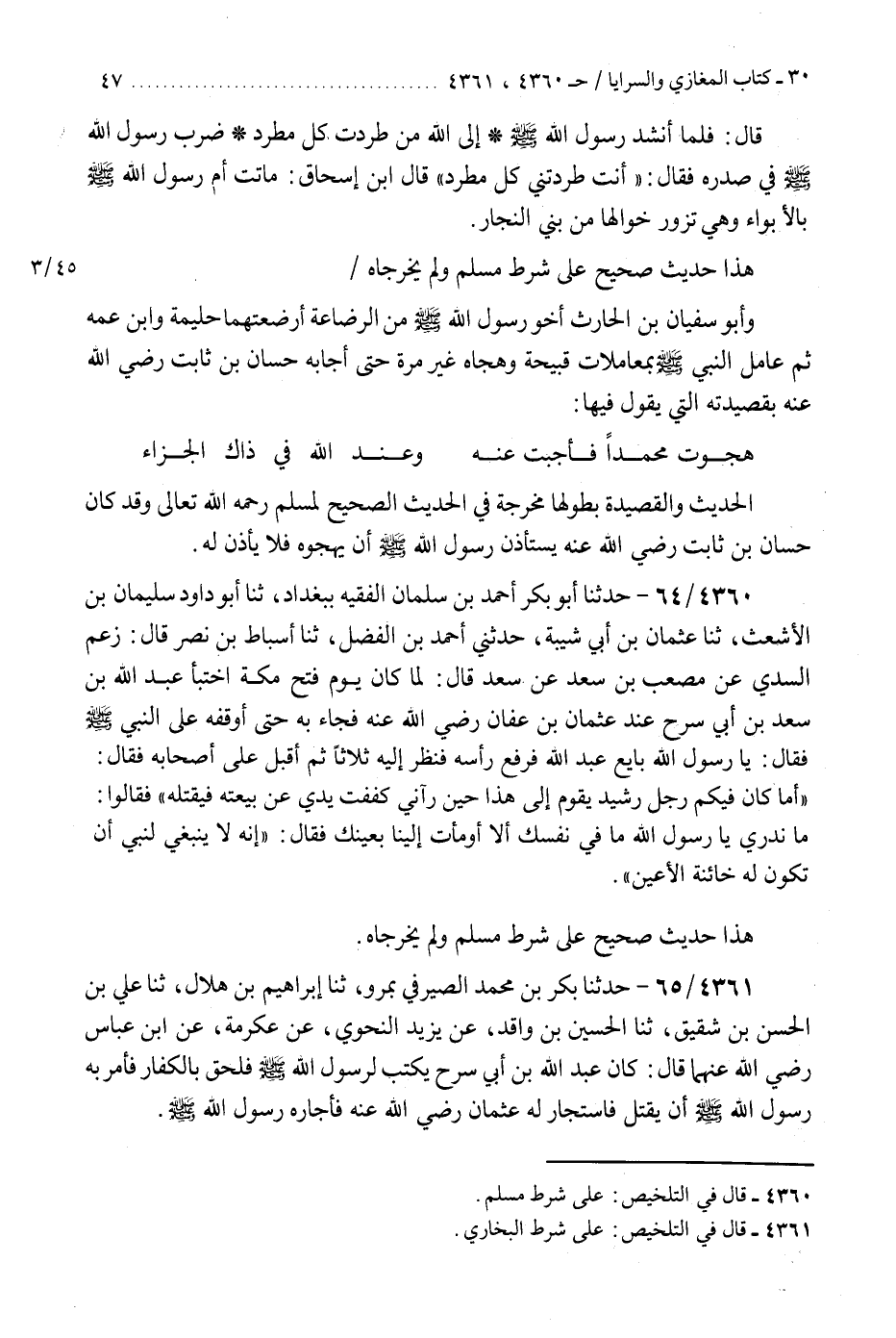 4361 - حَدَّثَنَا بَكْرُ بْنُ مُحَمَّدٍ الصَّيْرَفِيُّ، بِمَرْوَ، ثنا إِبْرَاهِيمُ بْنُ هِلَالٍ، ثنا عَلِيُّ بْنُ الْحَسَنِ بْنِ شَقِيقٍ، ثنا الْحُسَيْنُ بْنُ وَاقِدٍ، عَنْ يَزِيدَ النَّحْوِيِّ، عَنْ عِكْرِمَةَ، عَنِ ابْنِ عَبَّاسٍ رَضِيَ اللَّهُ عَنْهُمَا قَالَ: «كَانَ عَبْدُ اللَّهِ بْنُ أَبِي سَرْحٍ يَكْتُبُ لِرَسُولِ اللَّهِ صَلَّى اللهُ عَلَيْهِ وَسَلَّمَ فَلَحِقَ بِالْكُفَّارِ، §فَأَمَرَ بِهِ رَسُولُ اللَّهِ صَلَّى اللهُ عَلَيْهِ وَسَلَّمَ أَنْ يُقْتَلَ، فَاسْتَجَارَ لَهُ عُثْمَانُ رَضِيَ اللَّهُ عَنْهُ فَأَجَارَهُ رَسُولُ اللَّهِ صَلَّى اللهُ عَلَيْهِ وَسَلَّمَ» صَحِيحٌ عَلَى شَرْطِ الْبُخَارِيِّ، وَلَمْ يُخَرِّجَاهُ "K4361 - على شرط البخاري