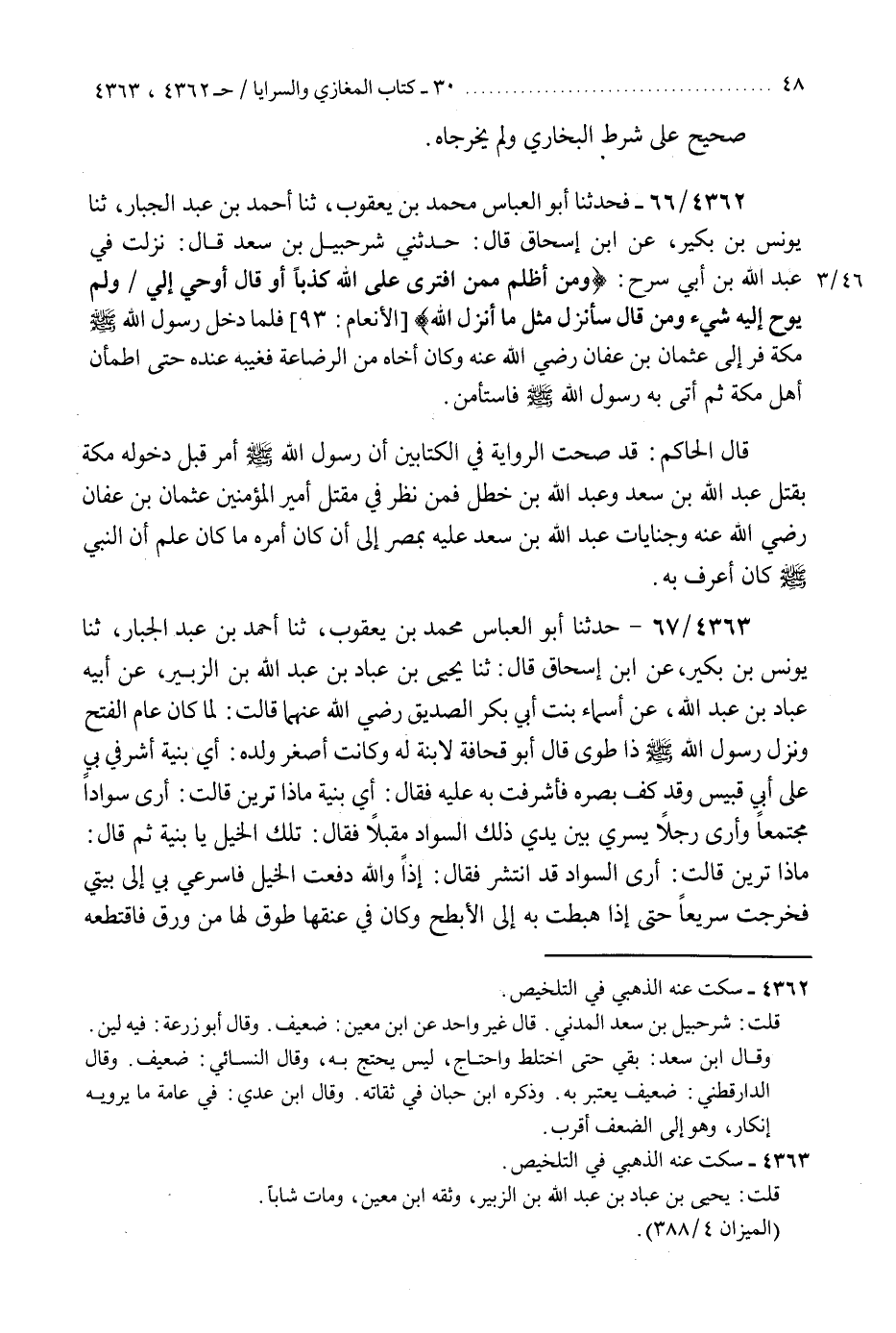4362 - فَحَدَّثَنَا أَبُو الْعَبَّاسِ مُحَمَّدُ بْنُ يَعْقُوبَ، ثنا أَحْمَدُ بْنُ عَبْدِ الْجَبَّارِ، ثنا يُونُسُ بْنُ بُكَيْرٍ، عَنِ ابْنِ إِسْحَاقَ، قَالَ: حَدَّثَنِي شُرَحْبِيلُ بْنُ سَعْدٍ، قَالَ: «نَزَلَتْ فِي عَبْدِ اللَّهِ بْنِ أَبِي سَرْحٍ» : {وَمَنْ أَظْلَمُ مِمَّنِ افْتَرَى عَلَى اللَّهِ كَذِبًا أَوْ قَالَ أُوحِيَ إِلَيَّ وَلَمْ يُوحَ إِلَيْهِ شَيْءٌ وَمَنْ قَالَ سَأُنْزِلُ مِثْلَ مَا أَنْزَلَ اللَّهُ} [الأنعام: 93] فَلَمَّا §«دَخَلَ رَسُولُ اللَّهِ صَلَّى اللهُ عَلَيْهِ وَسَلَّمَ مَكَّةَ فَرَّ إِلَى عُثْمَانَ بْنِ عَفَّانَ رَضِيَ اللَّهُ عَنْهُ، وَكَانَ أَخَاهُ مِنَ الرَّضَاعَةِ، فَغَيِّبَهُ عِنْدَهُ حَتَّى اطْمَأَنَّ أَهْلُ مَكَّةَ، ثُمَّ أَتَى بِهِ رَسُولَ اللَّهِ صَلَّى اللهُ عَلَيْهِ وَسَلَّمَ فَاسْتَأْمَنَ» قَالَ الْحَاكِمُ: «قَدْ صَحَّتِ الرِّوَايَةُ فِي الْكِتَابَيْنَ أَنَّ رَسُولَ اللَّهِ صَلَّى اللهُ عَلَيْهِ وَسَلَّمَ أَمَرَ قَبْلَ دُخُولِهِ مَكَّةَ بِقَتْلِ عَبْدِ اللَّهِ بْنِ سَعْدٍ وَعَبْدِ اللَّهِ بْنِ خَطَلٍ، فَمَنْ نَظَرَ فِي مَقْتَلِ أَمِيرِ الْمُؤْمِنِينَ عُثْمَانَ بْنِ عَفَّانَ رَضِيَ اللَّهُ عَنْهُ وَجِنَايَاتِ عَبْدِ اللَّهِ بْنِ سَعْدٍ عَلَيْهِ بِمِصْرَ إِلَى أَنْ كَانَ أَمْرُهُ مَا كَانَ عَلِمَ أَنَّ النَّبِيَّ صَلَّى اللهُ عَلَيْهِ وَسَلَّمَ كَانَ أَعْرَفَ بِهِ» K4362 - سكت عنه الذهبي في التلخيص