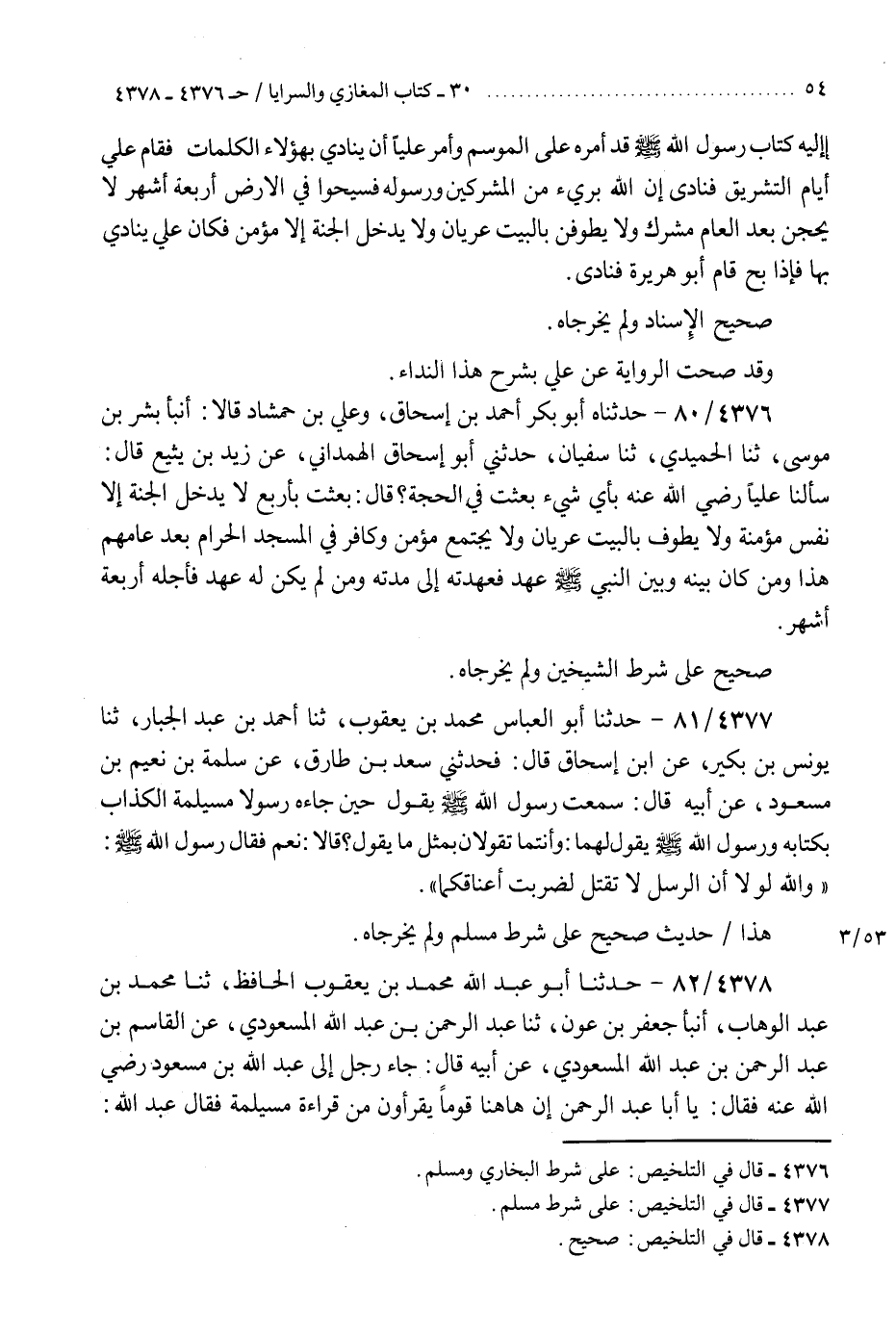 4376 - حَدَّثَنَاهُ أَبُو بَكْرٍ أَحْمَدُ بْنُ إِسْحَاقَ، وَعَلِيُّ بْنُ حَمْشَاذٍ، قَالَا: أَنْبَأَ بِشْرُ بْنُ مُوسَى، ثنا الْحُمَيْدِيُّ، ثنا سُفْيَانُ، حَدَّثَنِي أَبُو إِسْحَاقَ الْهَمْدَانِيُّ، عَنْ زَيْدِ بْنِ يُثَيْعٍ قَالَ: سَأَلْنَا عَلِيًّا رَضِيَ اللَّهُ عَنْهُ بِأَيِّ شَيْءٍ بُعِثْتَ فِي الْحَجَّةِ، قَالَ: " §بُعِثْتُ بِأَرْبَعٍ: لَا يَدْخُلُ الْجَنَّةَ إِلَّا نَفْسٌ مُؤْمِنَةٌ، وَلَا يَطُوفُ بِالْبَيْتِ عُرْيَانٌ، وَلَا يَجْتَمِعُ مُؤْمِنٌ وَكَافِرٌ فِي الْمَسْجِدِ الْحَرَامِ بَعْدَ عَامِهِمْ، هَذَا، وَمَنْ كَانَ بَيْنَهُ وَبَيْنَ النَّبِيِّ صَلَّى اللهُ عَلَيْهِ وَسَلَّمَ عَهْدٌ فَعَهْدُهُ إِلَى مُدَّتِهِ، وَمَنْ لَمْ يَكُنْ لَهُ عَهْدٌ فَأَجَلُهُ أَرْبَعَةُ أَشْهُرٍ «صَحِيحٌ عَلَى شَرْطِ الشَّيْخَيْنِ، وَلَمْ يُخَرِّجَاهُ» K4376 - على شرط البخاري ومسلم