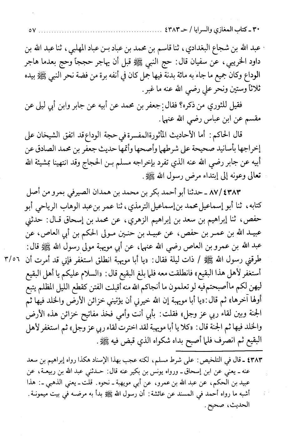 4383 - حَدَّثَنَا أَبُو أَحْمَدَ بَكْرُ بْنُ مُحَمَّدِ بْنِ حِمْدَانَ الصٌّيْرَفِيُّ، بِمَرْوَ مِنْ أَصْلِ كِتَابِهِ، ثنا أَبُو إِسْمَاعِيلَ مُحَمَّدُ بْنُ إِسْمَاعِيلَ التِّرْمِذِيُّ، ثنا عُمَرُ بْنُ عَبْدِ الْوَهَّابِ الرِّيَاحِيُّ أَبُو حَفْصٍ، ثنا إِبْرَاهِيمُ بْنُ سَعْدِ بْنِ إِبْرَاهِيمَ الزُّهْرِيُّ، عَنْ مُحَمَّدِ بْنِ إِسْحَاقَ قَالَ: حَدَّثَنِي عُبَيْدُ اللَّهِ بْنُ عُمَرَ بْنِ حَفْصٍ، عَنْ عُبَيْدِ بْنِ حُنَيْنٍ، مَوْلَى الْحَكَمِ بْنِ أَبِي الْعَاصِ، عَنْ عَبْدِ اللَّهِ بْنِ عَمْرِو بْنِ الْعَاصِ رَضِيَ اللَّهُ عَنْهُمَا، عَنْ أَبِي مُوَيْهِبَةَ، مَوْلَى رَسُولِ اللَّهِ صَلَّى اللهُ عَلَيْهِ وَسَلَّمَ قَالَ: طَرَقَنِي رَسُولُ اللَّهِ صَلَّى اللهُ عَلَيْهِ وَسَلَّمَ ذَاتَ لَيْلَةٍ، فَقَالَ: «يَا أَبَا مُوَيْهِبَةَ انْطَلِقِ اسْتَغْفِرْ فَإِنِّي قَدْ أُمِرْتُ أَنْ أَسْتَغْفِرَ لِأَهْلِ هَذَا الْبَقِيعِ» فَانْطَلَقْتُ مَعَهُ فَلَمَّا بَلَغَ الْبَقِيعَ، قَالَ: «السَّلَامُ عَلَيْكُمْ يَا أَهْلَ الْبَقِيعِ، لِيَهُنْ لَكُمْ مَا أَصْبَحْتُمْ فِيهِ لَوْ تَعْلَمُونَ مَا أَنْجَاكَمُ اللَّهُ مِنْهُ، أَقْبَلَتِ الْفِتَنُ كَقِطَعِ اللَّيْلِ الْمُظْلِمِ يَتْبَعُ أَوَّلُهَا خِرَهَا» ثُمَّ قَالَ: «يَا أَبَا مُوَيْهِبَةَ، إِنَّ §اللَّهَ خَيَّرَنِي أَنْ يُؤْتِيَنِي خَزَائِنَ الْأَرْضِ وَالْخُلْدَ فِيهَا، ثُمَّ الْجَنَّةَ وَبَيْنَ لِقَاءِ رَبِّي عَزَّ وَجَلَّ» فَقُلْتُ: بِأَبِي أَنْتَ وَأُمِّي فَخُذْ مَفَاتِيحَ خَزَائِنِ هَذِهِ الْأَرْضِ وَالْخُلْدَ فِيهَا ثُمَّ الْجَنَّةَ، قَالَ: «كَلَّا يَا أَبَا مُوَيْهِبَةَ، لَقَدِ اخْتَرْتُ لِقَاءَ رَبِّي عَزَّ وَجَلَّ» ثُمَّ اسْتَغْفَرَ لِأَهْلِ الْبَقِيعِ ثُمَّ انْصَرَفَ، فَلَمَّا أَصْبَحَ بَدَأَهُ شَكْوَاهُ الَّذِي قُبِضَ فِيهِ صَلَّى اللهُ عَلَيْهِ وَسَلَّمَ «هَذَا حَدِيثٌ صَحِيحٌ عَلَى شَرْطِ مُسْلِمٍ إِلَّا أَنَّهُ عَجَبَ بِهَذَا الْإِسْنَادِ فَقَدْ»