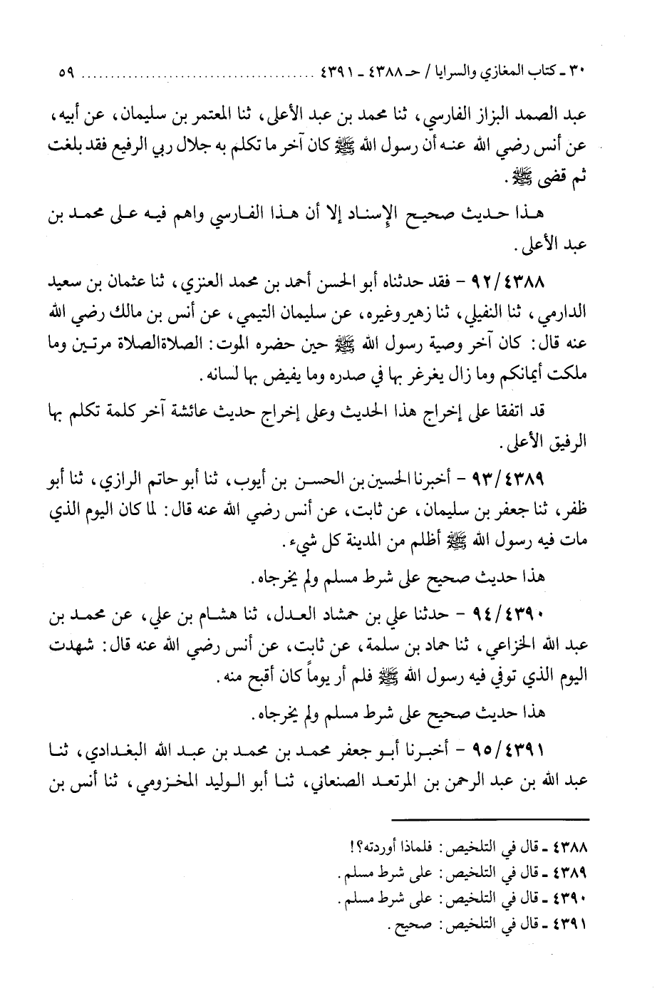 4388 - فَقَدْ حَدَّثَنَاهُ أَبُو الْحَسَنِ أَحْمَدُ بْنُ مُحَمَّدٍ الْعَنَزِيُّ، ثنا عُثْمَانُ بْنُ سَعِيدٍ الدَّارِمِيُّ، ثنا النُّفَيْلِيُّ، ثنا زُهَيْرٌ، وَغَيْرُهُ، عَنْ سُلَيْمَانَ التَّيْمِيِّ، عَنْ أَنَسِ بْنِ مَالِكٍ رَضِيَ اللَّهُ عَنْهُ قَالَ: كَانَ §آخِرُ وَصِيَّةِ رَسُولِ اللَّهِ صَلَّى اللهُ عَلَيْهِ وَسَلَّمَ حِينَ حَضَرَهُ الْمَوْتُ: «الصَّلَاةَ الصَّلَاةَ» مَرَّتَيْنِ، «وَمَا مَلَكَتْ أَيْمَانُكُمْ» وَمَا زَالَ يُغَرْغِرُ بِهَا فِي صَدْرِهِ وَمَا يَفِيضُ بِهَا لِسَانُهُ «قَدِ اتَّفَقَا عَلَى إِخْرَاجِ هَذَا الْحَدِيثِ، وَعَلَى إِخْرَاجِ حَدِيثِ عَائِشَةَ آخِرُ كَلِمَةٍ تَكَلَّمَ بِهَا» الرَّفِيقُ الْأَعْلَى "