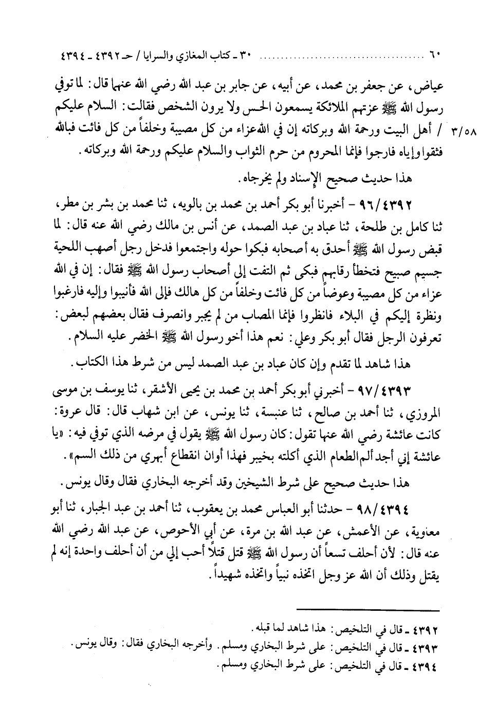 4394 - حَدَّثَنَا أَبُو الْعَبَّاسِ مُحَمَّدُ بْنُ يَعْقُوبَ، ثنا أَحْمَدُ بْنُ عَبْدِ الْجَبَّارِ، ثنا أَبُو مُعَاوِيَةَ، عَنِ الْأَعْمَشِ، عَنْ عَبْدِ اللَّهِ بْنِ مُرَّةَ، عَنْ أَبِي الْأَحْوَصِ، عَنْ عَبْدِ اللَّهِ رَضِيَ اللَّهُ عَنْهُ قَالَ: §«لِأَنْ أَحْلِفُ تِسْعًا أَنَّ رَسُولَ اللَّهِ صَلَّى اللهُ عَلَيْهِ وَسَلَّمَ قُتِلَ قَتْلًا أَحَبُّ إِلَيَّ مِنْ أَنْ أَحْلِفَ وَاحِدَةً إِنَّهُ لَمْ يُقْتَلْ، وَذَلِكَ أَنَّ اللَّهَ عَزَّ وَجَلَّ اتَّخَذَهُ نَبِيًّا وَاتَّخَذَهُ شَهِيدًا» هَذَا حَدِيثٌ صَحِيحٌ عَلَى شَرْطِ الشَّيْخَيْنِ وَلَمْ يُخَرِّجَاهُ "K4394 - على شرط البخاري ومسلم