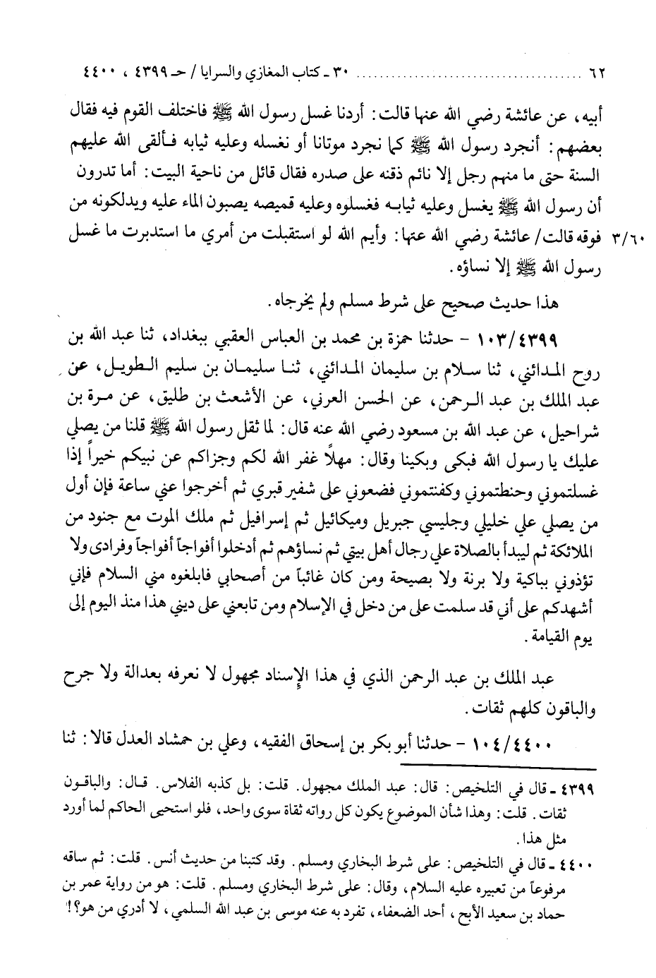 4399 - حَدَّثَنَا حَمْزَةُ بْنُ مُحَمَّدِ بْنِ الْعَبَّاسِ الْعَقَبِيُّ، بِبَغْدَادَ، ثنا عَبْدُ اللَّهِ بْنُ رَوْحٍ الْمَدَائِنِيُّ، ثنا سَلَّامُ بْنُ سُلَيْمَانَ الْمَدَائِنِيُّ، ثنا سَلَامُ بْنُ سُلَيْمٍ الطَّوِيلُ، عَنْ عَبْدِ الْمَلِكِ بْنِ عَبْدِ الرَّحْمَنِ، عَنِ الْحَسَنِ الْعُرَنِيِّ، عَنِ الْأَشْعَثِ بْنِ طَلِيقٍ، عَنْ مُرَّةَ بْنِ شَرَاحِيلَ، عَنْ عَبْدِ اللَّهِ بْنِ مَسْعُودٍ رَضِيَ اللَّهُ عَنْهُ قَالَ: لَمَّا ثَقُلَ رَسُولُ اللَّهِ صَلَّى اللهُ عَلَيْهِ وَسَلَّمَ قُلْنَا: مَنْ يُصَلِّي عَلَيْكَ يَا رَسُولَ اللَّهِ فَبَكَى وَبَكَيْنَا وَقَالَ: «مَهْلًا، §غَفَرَ اللَّهُ لَكُمْ، وَجَزَاكُمْ عَنْ نَبِيِّكُمْ خَيْرًا، إِذَا غَسَّلْتُمُونِي وَحَنَّطْتُمُونِي وَكَفَّنْتُمُونِي فَضَعُونِي عَلَى شَفِيرِ قَبْرِي، ثُمَّ اخْرِجُوا عَنِّي سَاعَةً، فَإِنَّ أَوَّلَ مَنْ يُصَلِّي عَلَيَّ خَلِيلِي وَجَلِيسِي جِبْرِيلُ وَمِيكَائِيلُ، ثُمَّ إِسْرَافِيلُ، ثُمَّ مَلَكُ الْمَوْتِ مَعَ جُنُودٍ مِنَ الْمَلَائِكَةِ، ثُمَّ لِيَبْدَأْ بِالصَّلَاةِ عَلَيَّ رِجَالُ أَهْلِ بَيْتِي، ثُمَّ نِسَاؤُهُمْ، ثُمَّ ادْخُلُوا أَفْوَاجًا أَفْوَاجًا وَفُرَادَى وَلَا تُؤْذُونِي بِبَاكِيةٍ، وَلَا بِرَنَّةٍ وَلَا بِصَيْحَةٍ، وَمَنْ كَانَ غَائِبًا مِنْ أَصْحَابِي فَأَبْلِغُوهُ مِنِّي السَّلَامَ، فَإِنِّي أُشْهِدُكُمْ عَلَى أَنِّي قَدْ سَلَّمْتُ عَلَى مَنْ دَخَلَ فِي الْإِسْلَامِ، وَمَنْ تَابَعَنِي عَلَى دِينِي هَذَا مُنْذُ الْيَوْمِ إِلَى يَوْمِ الْقِيَامَةِ» عَبْدُ الْمَلِكِ بْنُ عَبْدِ الرَّحْمَنِ الَّذِي فِي هَذَا الْإِسْنَادِ مَجْهُولٌ، لَا نَعْرِفُهُ بِعَدَالَةٍ وَلَا جَرْحٍ وَالْبَاقُونَ كُلُّهُمْ ثِقَاتٌ "K4399 - عبد الملك مجهول