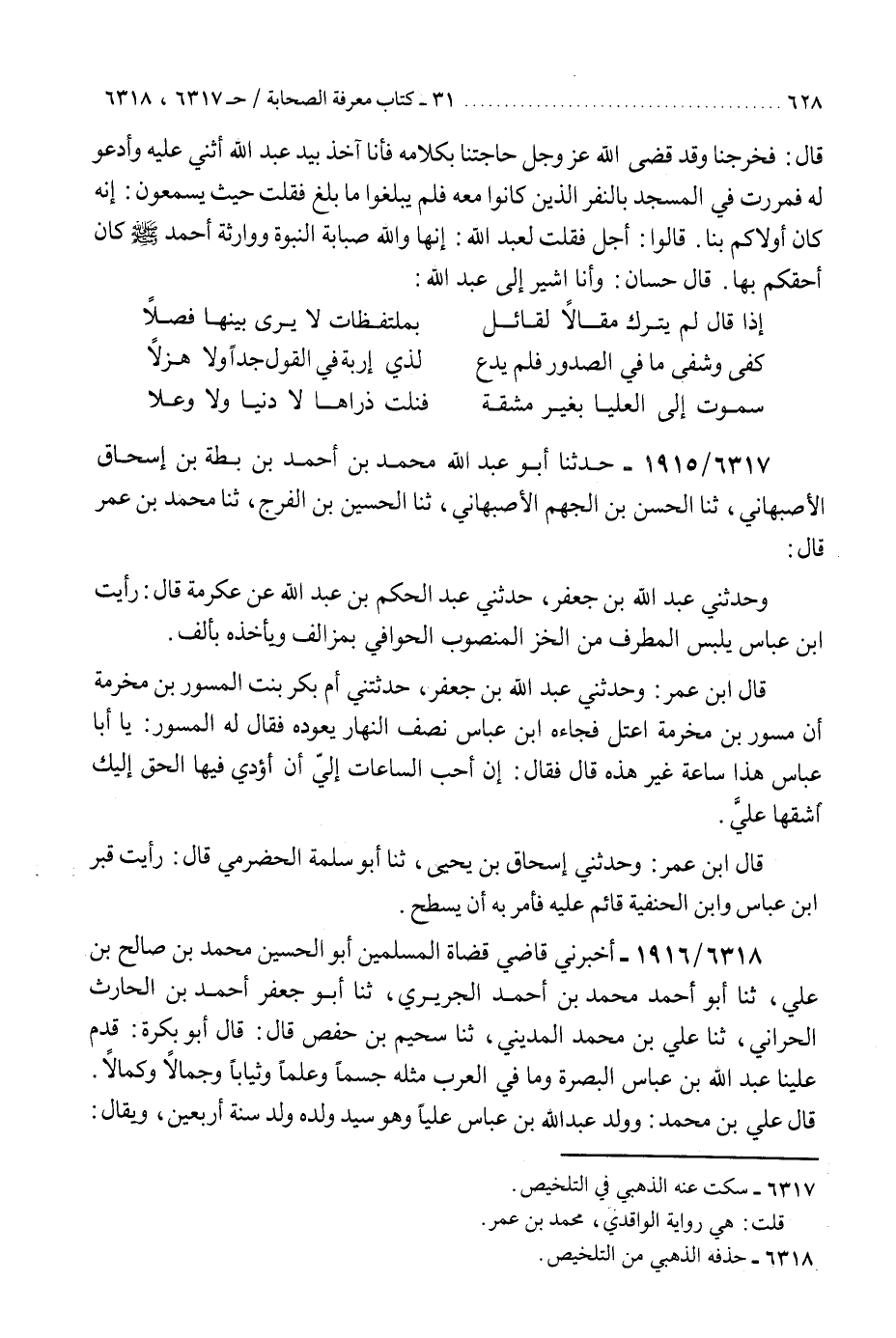 6318 - أَخْبَرَنِي قَاضِي قُضَاةِ الْمُسْلِمِينَ أَبُو الْحُسَيْنِ مُحَمَّدُ بْنُ صَالِحِ بْنِ عَلِيٍّ، ثَنَا أَبُو أَحْمَدَ مُحَمَّدُ بْنُ أَحْمَدَ الْجُرَيْرِيُّ، ثَنَا أَبُو جَعْفَرٍ أَحْمَدُ بْنُ الْحَارِثِ الْحَرَّانِيُّ، ثَنَا عَلِيُّ بْنُ مُحَمَّدٍ الْمَدِينِيُّ، ثَنَا سُحَيْمُ بْنُ حَفْصٍ، قَالَ: قَالَ أَبُو بَكْرَةَ: §«قَدِمَ عَلَيْنَا عَبْدُ اللَّهِ بْنُ عَبَّاسٍ الْبَصْرَةَ وَمَا فِي الْعَرَبِ مِثْلُهُ جِسْمًا وَعِلْمًا وَثِيَابًا وَجَمَالًا وَكَمَالًا» قَالَ عَلِيُّ بْنُ مُحَمَّدٍ: «وَوَلَدُ عَبْدِ اللَّهِ بْنِ عَبَّاسٍ عَلِيًّا وَهُوَ سَيِّدُ وَلَدِهِ، وُلِدَ سَنَةَ أَرْبَعِينَ، وَيُقَالُ وُلِدَ عَامَ الْجَمَلِ سَنَةَ سِتٍّ وَثَلَاثِينَ، وَكَانَ أَجْمَلَ قُرَشِيٍّ عَلَى الْأَرْضِ وَأَوْسَمَهُ، وَأَكْثَرَهُ صَلَاةً، وَكَانَ يُدْعَى السَّجَّادُ، وَفِي عَقِبِهِ الْخِلَافَةُ، وَعَبَّاسًا، وَهُوَ أَكْبَرُ وَلَدِهِ، وَبِهِ كَانَ يُكَنَّى، وَمُحَمَّدٌ، وَعُبَيْدُ اللَّهِ، وَالْفَضْلُ، وَلُبَابَةُ أُمُّهُمْ زُرْعَةُ بِنْتُ مُسَرِّحِ بْنِ مَعْدِي كَرِبَ بْنِ وَلِيعَةَ، وَمُسَرِّحٌ أَحَدُ الْمُلُوكِ الْأَرْبَعَةِ، وَلَا بَقِيَّةَ لِلْعَبَّاسِ، وَعُبَيْدُ اللَّهِ، وَالْفَضْلُ، وَمُحَمَّدٌ بَنِي عَبْدِ اللَّهِ بْنِ عَبَّاسٍ، وَأَمَّا لُبَابَةُ بِنْتُ عَبْدِ اللَّهِ فَإِنَّهَا كَانَتْ تَحْتَ عَلِيِّ بْنِ عَبْدِ اللَّهِ بْنِ جَعْفَرِ بْنِ أَبِي طَالِبٍ فَوَلَدَتْ لَهُ وَلِوَلَدِهَا أَعْقَابٌ، وَأَسْمَاءُ بِنْتُ عَبْدِ اللَّهِ كَانَتْ عِنْدَ عَبْدِ اللَّهِ بْنِ عَبْدِ اللَّهِ بْنِ الْعَبَّاسِ، فَوَلَدَتْ لَهُ حَسَنًا، وَحُسَيْنًا، وَأُمُّهَا أُمُّ وَلَدٍ»